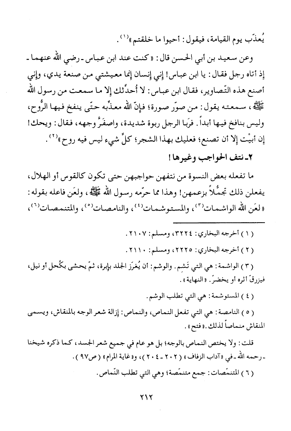 ما تفعله بعض النسوة من نتفهن حواجبهن حتى تكون كالقوس أو الهلال، يفعلق ذلك تجمُّلاً بزعمهن! وهذا مما حرّمه رسول الله - صَلَّى اللَّهُ عَلَيْهِ وَسَلَّمَ -، ولعَن فاعله بقوله: "لعَن الله الواشمات (¬3)، والمستوشمات (¬4)، والنامصات (¬5)، والمتنمصات (¬6)،