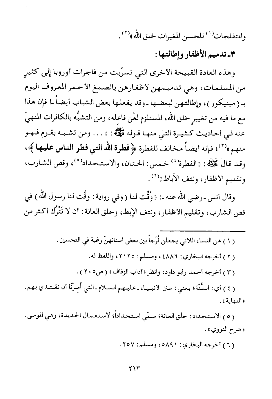 وهذه العادة القبيحة الأخرى التي تسرّبت من فاجرات أوروبا إِلى كثيرٍ من المسلمات، وهي تدميمهن لأظفارهن بالصمغ الأحمر المعروف اليوم بـ (مينيكور)، وإِطالتهن لبعضها -وقد يفعلها بعض الشباب أيضاً-! فإِن هذا مع ما فيه من تغييرٍ لخلق الله، المستلزم لعْن فاعله، ومن التشبُّه بالكافرات المنهيّ عنه في أحاديث كثيرة التي منها قوله - صَلَّى اللَّهُ عَلَيْهِ وَسَلَّمَ -: " ... ومن تشبه بقوم فهو منهم" (¬3)؛ فإِنه أيضاً مخالف للفطرة {فطرة الله التي فطر الناس عليها}، وقد قال - صَلَّى اللَّهُ عَلَيْهِ وَسَلَّمَ -: "الفطرة (¬4) خمس: الختان، والاستحداد (¬5)، وقص الشارب، وتقليم الأظفار، ونتف الآباط" (¬6).