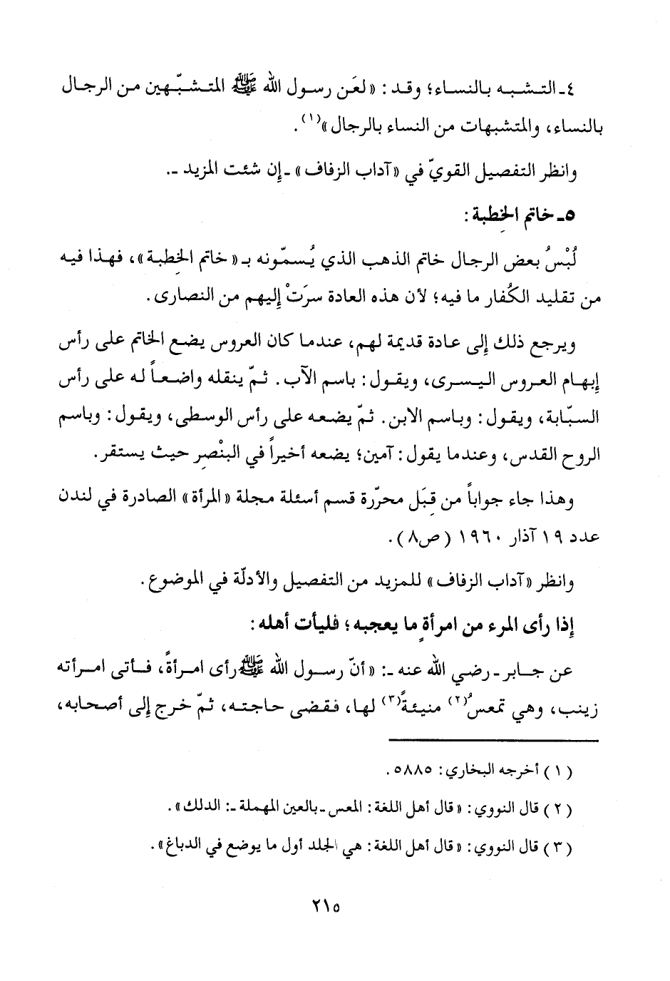 وانظر التفصيل القويّ في "آداب الزفاف" -إِن شئت المزيد-.