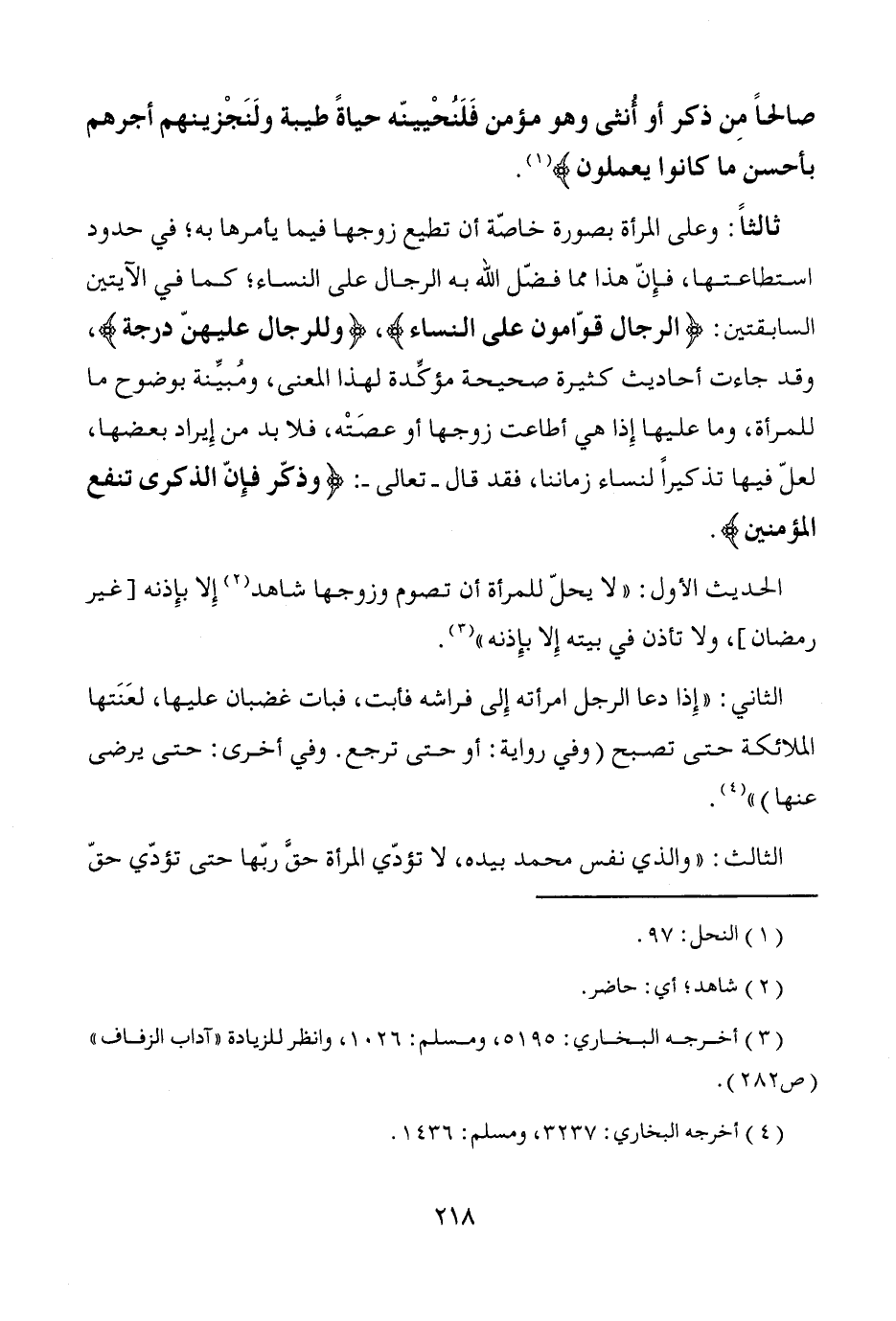 ثالثاً: وعلى المرأة بصورة خاصّة أن تطيع زوجها فيما يأمرها به، في حدود استطاعتها، فإِنّ هذا مما فضّل الله به الرجال على النساء؛ كما في الآيتين السابقتين: {الرجال قوّامون على النساء}، {وللرجال عليهنّ درجة}، وقد جاءت أحاديث كثيرة صحيحة مؤكِّدة لهذا المعنى، ومُبيِّنة بوضوح ما للمرأة، وما عليها إِذا هي أطاعت زوجها أو عصَتْه، فلا بد من إِيراد بعضها، لعلّ فيها تذكيراً لنساء زماننا، فقد قال -تعالى-: {وذكّر فإِنّ الذكرى تنفع المؤمنين}.