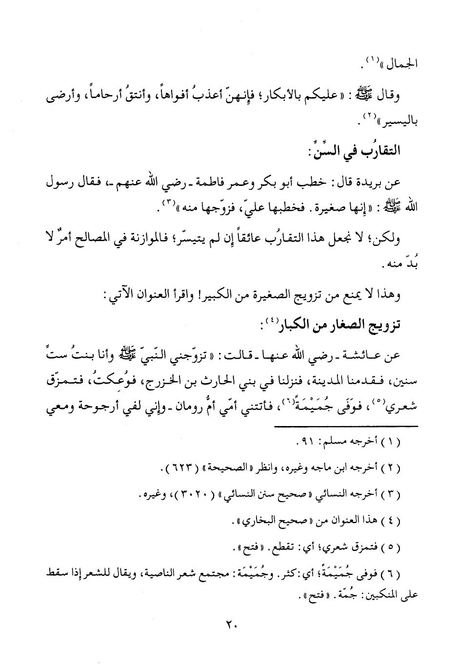 عن عائشة -رضي الله عنها- قالت: "تزوّجني النّبيّ - صَلَّى اللَّهُ عَلَيْهِ وَسَلَّمَ - وأنا بنتُ ستِّ سنين، فقدمنا المدينة، فنزلنا في بني الحارث بن الخزرج، فوُعِكتُ، فتمزّق شعري (¬5)، فوَفَى جُمَيْمَةً (¬6)، فأتتني أمّي أمُّ رومان -وإني لفي أرجوحة ومعي