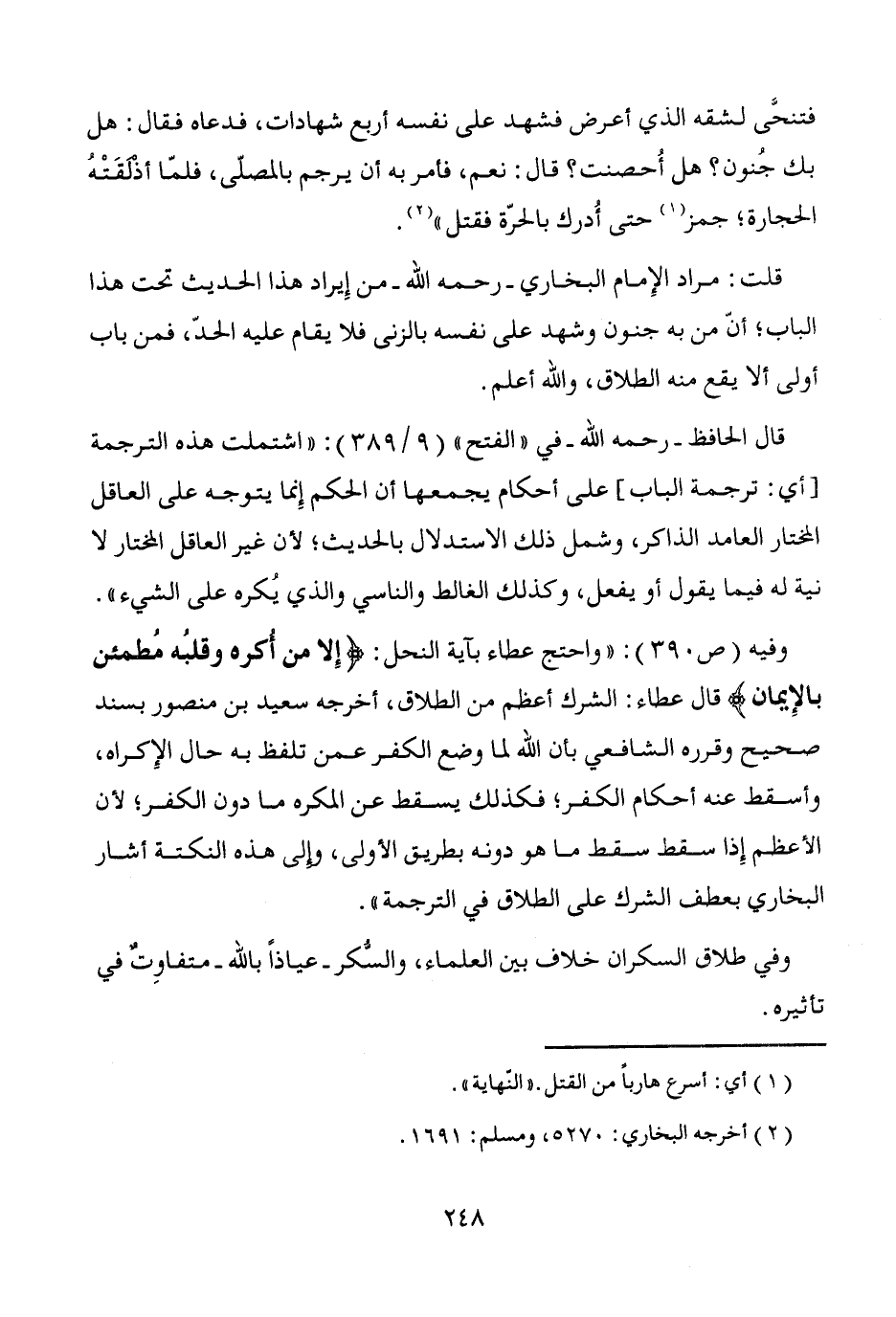 وفيه (ص390): "واحتج عطاء بآية النحل: {إِلا من أُكره وقلبُه مُطمئن بالإِيمان} قال عطاء: الشرك أعظم من الطلاق، أخرجه سعيد بن منصور بسند صحيح وقرره الشافعي بأن الله لما وضع الكفر عمن تلفظ به حال الإِكراه، وأسقط عنه أحكام الكفر؛ فكذلك يسقط عن المكره ما دون الكفر؛ لأن الأعظم إِذا سقط سقط ما هو دونه بطريق الأولى، وإلى هذه النكتة أشار البخاري بعطف الشرك على الطلاق في الترجمة".