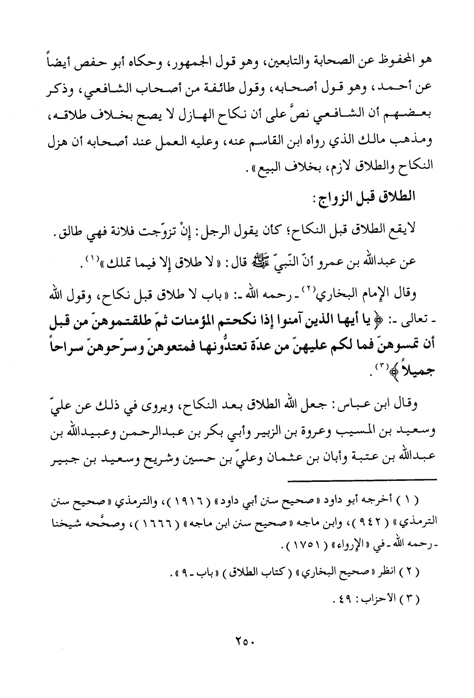 وقال الإِمام البخاري (¬2) -رحمه الله-: "باب لا طلاق قبل نكاح، وقول الله -تعالى-: {يا أيها الذين آمنوا إِذا نكحتم المؤمنات ثمّ طلقتموهنّ من قبل أن تمسوهنّ فما لكم عليهنّ من عدّة تعتدُّونها فمتعوهنّ وسرّحوهنّ سراحاً جميلاً} (¬3).