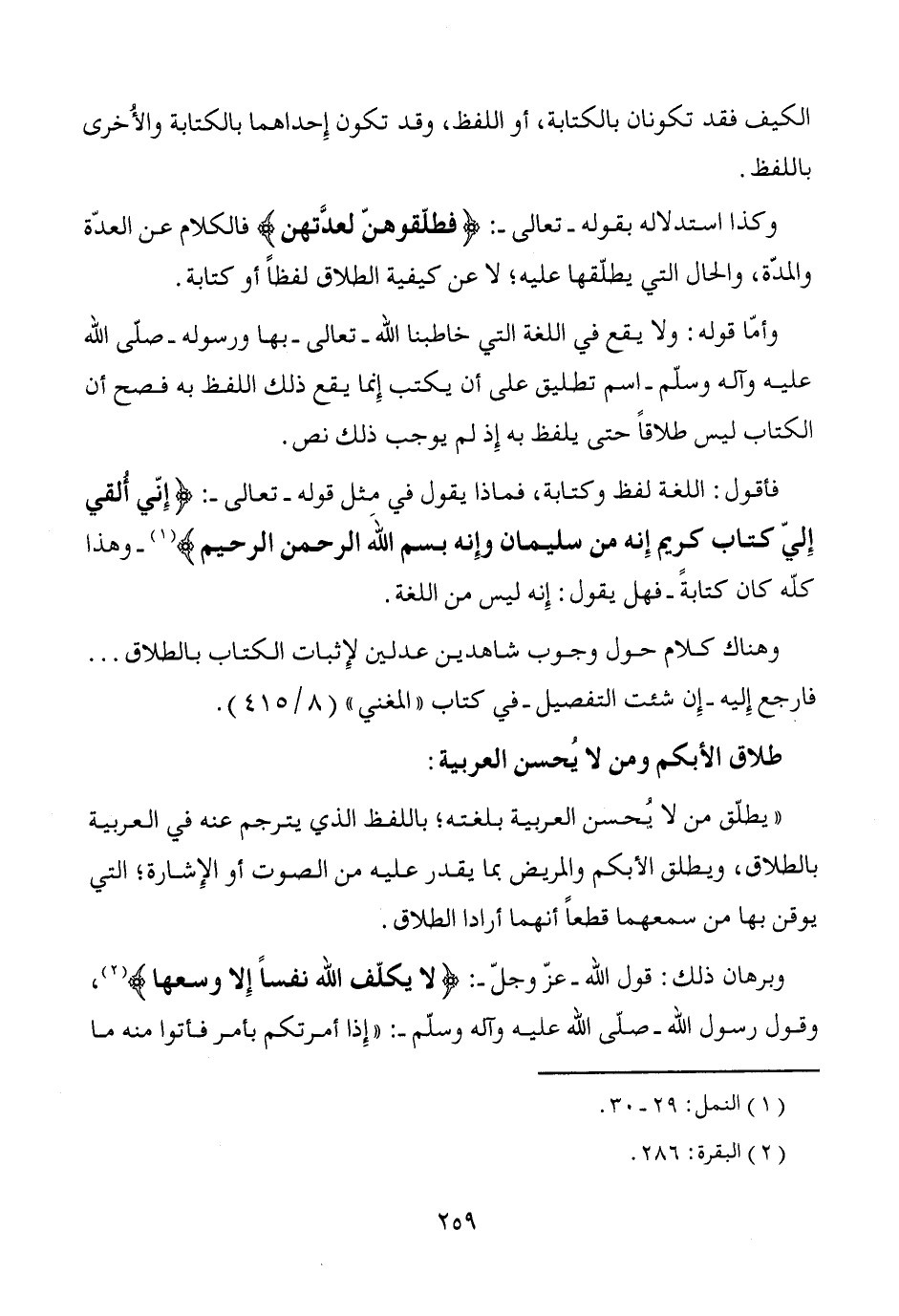 "يطلّق من لا يُحسن العربية بلغته؛ باللفظ الذي يترجم عنه في العربية بالطلاق، ويطلق الأبكم والمريض بما يقدر عليه من الصوت أو الإِشارة؛ التي يوقن بها من سمعهما قطعاً أنهما أرادا الطلاق.