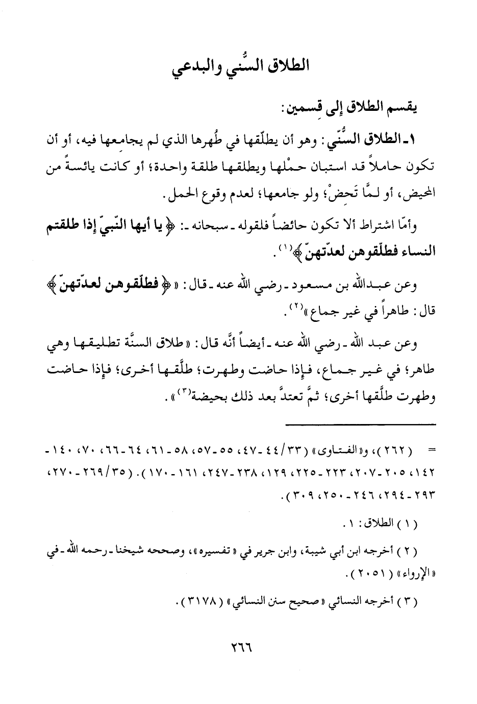 1 - الطلاق السُّنّي: وهو أن يطلّقها في طُهرها الذي لم يجامِعها فيه، أو أن تكون حاملاً قد استبان حمْلها ويطلقها طلقة واحدة؛ أو كانت يائسةً من المحيض، أو لمَّا تَحِضْ؛ ولو جامعها؛ لعدم وقوع الحمل.