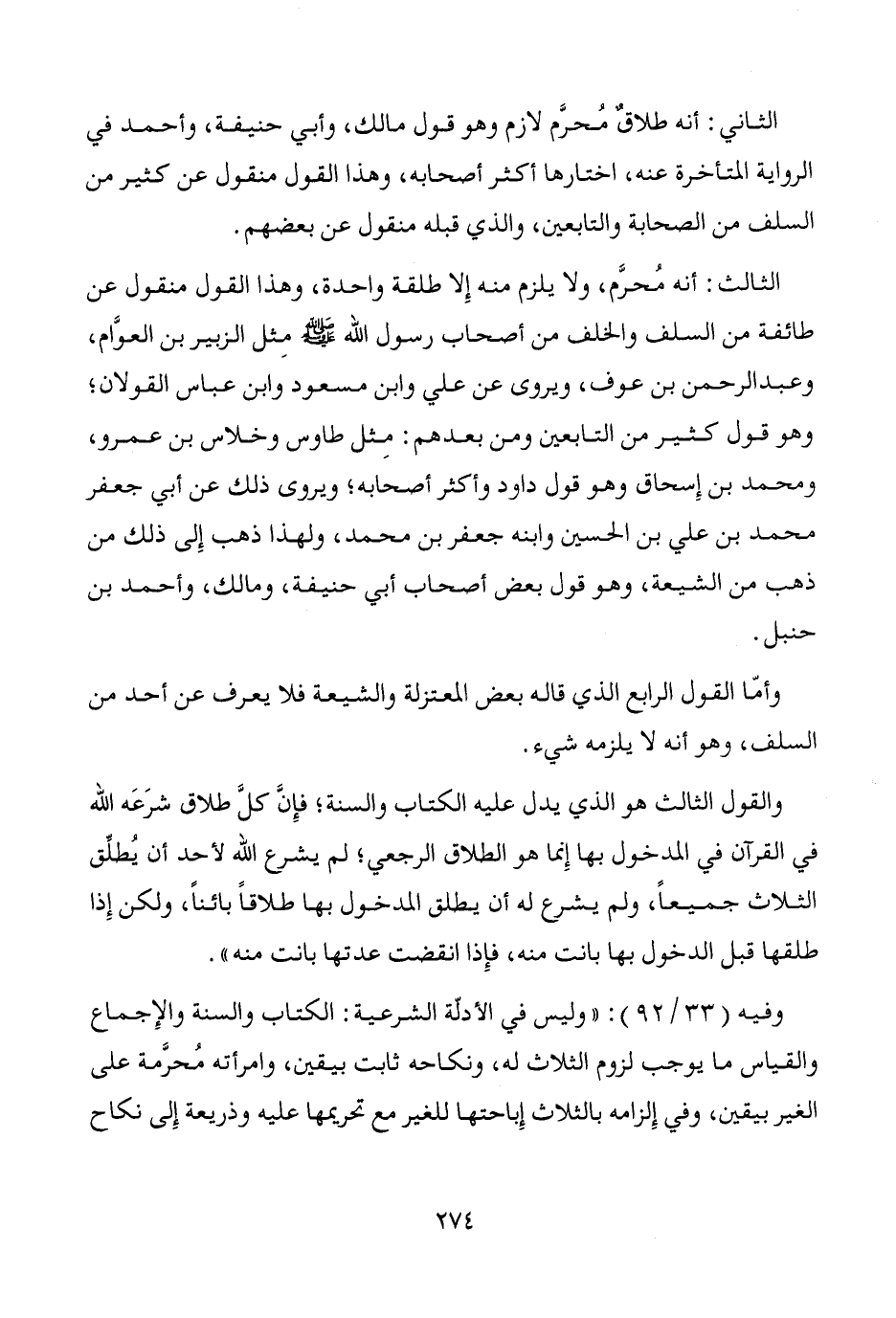 وفيه (33/ 92): "وليس في الأدلة الشرعية: الكتاب والسنة والإِجماع والقياس ما يوجب لزوم الثلاث له، ونكاحه ثابت بيقين، وامرأته مُحرَّمة على الغير بيقين، وفي إِلزامه بالثلاث إِباحتها للغير مع تحريمها عليه وذريعة إِلى نكاح