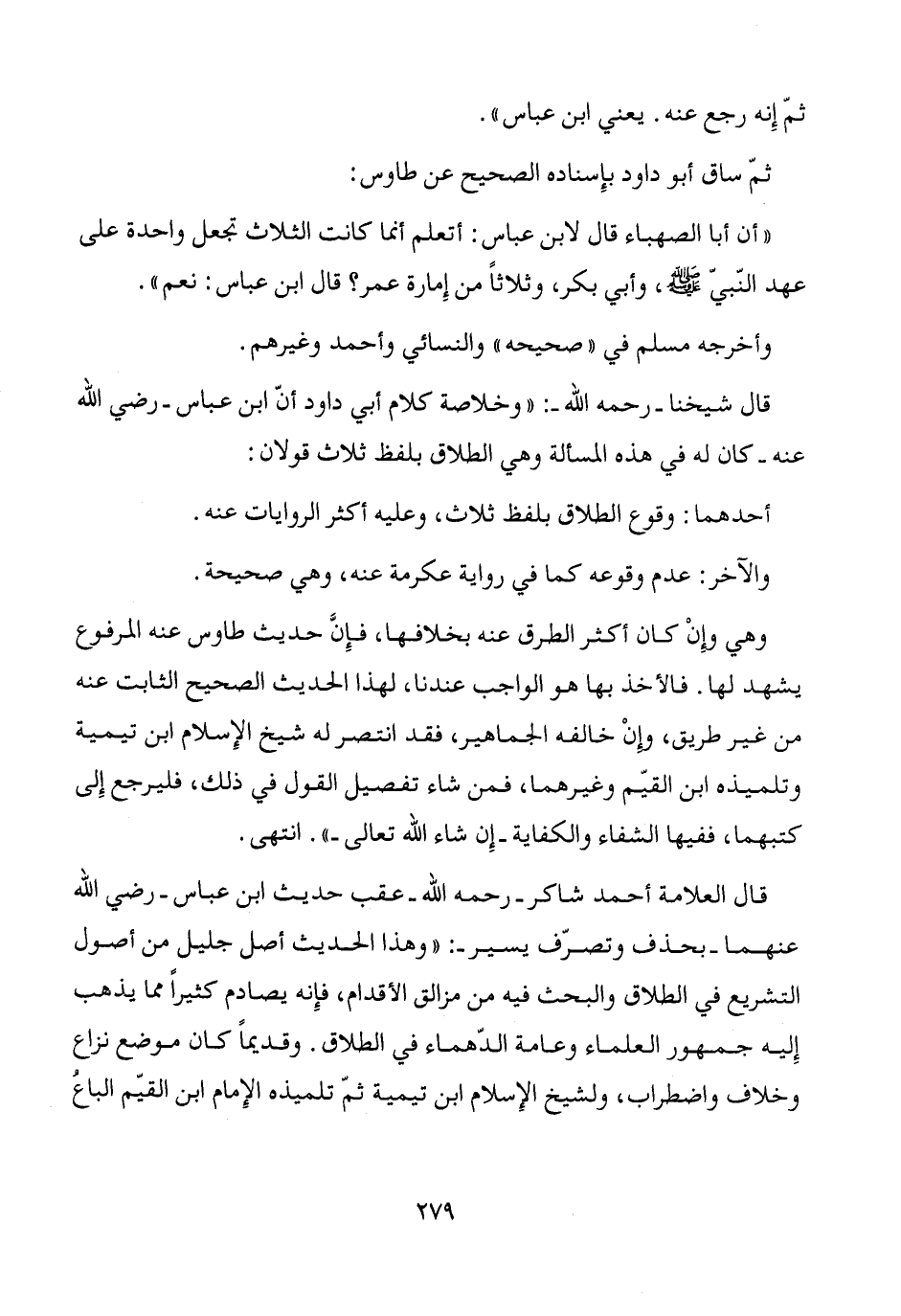 قال العلامة أحمد شاكر -رحمه الله- عقب حديث ابن عباس -رضي الله عنهما- بحذف وتصرّف يسير-: "وهذا الحديث أصل جليل من أصول التشريع في الطلاق والبحث فيه من مزالق الأقدام، فإِنه يصادم كثيراً مما يذهب إِليه جمهور العلماء وعامة الدّهماء في الطلاق. وقديماً كان موضع نزاع وخلاف واضطراب، ولشيخ الإِسلام ابن تيمية ثمّ تلميذه الإِمام ابن القيّم الباعُ
