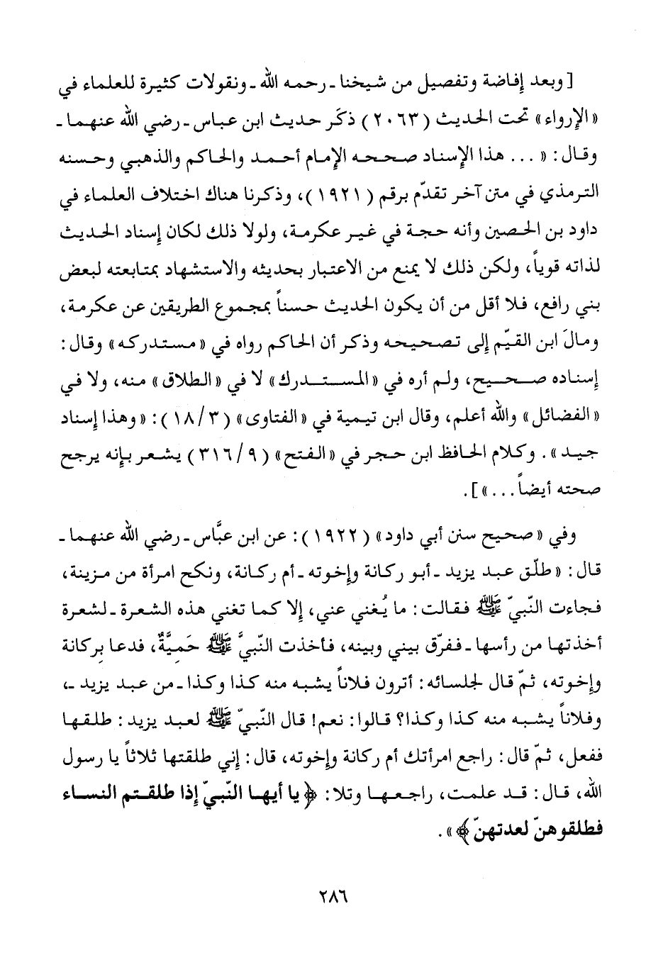 [وبعد إِفاضة وتفصيل من شيخنا -رحمه الله- ونقولات كثيرة للعلماء في "الإِرواء" تحت الحديث (2063) ذكَر حديث ابن عباس -رضي الله عنهما- وقال: " ... هذا الإِسناد صححه الإِمام أحمد والحاكم والذهبي وحسنه الترمذي في متن آخر تقدّم برقم (1921)، وذكرنا هناك اختلاف العلماء في داود بن الحصين وأنه حجة في غير عكرمة، ولولا ذلك لكان إسناد الحديث لذاته قوياً، ولكن ذلك لا يمنع من الاعتبار بحديثه والاستشهاد بمتابعته لبعض بني رافع، فلا أقل من أن يكون الحديث حسناً بمجموع الطريقين عن عكرمة، ومالَ ابن القيّم إِلى تصحيحه وذكر أن الحاكم رواه في "مستدركه" وقال: إِسناده صحيح، ولم أره في "المستدرك" لا في "الطلاق" منه، ولا في "الفضائل" والله أعلم، وقال ابن تيمية في "الفتاوى" (3/ 18): "وهذا إِسناد جيد". وكلام الحافظ ابن حجر في "الفتح" (9/ 316) يشعر بإِنه يرجح صحته أيضاً ... "].