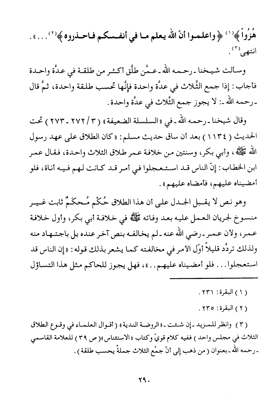 (¬3) وانظر للمزيد -إِن شئت- "الروضة الندية" (أقوال العلماء في وقوع الطلاق الثلاث في مجلس واحد) ففيه كلام قويّ وكتاب "الاستئناس" (ص 39) للعلامة القاسمي -رحمه الله- بعنوان (من ذهب إِلى أنّ جمْع الثلاث جملةً يحسب طلقة).