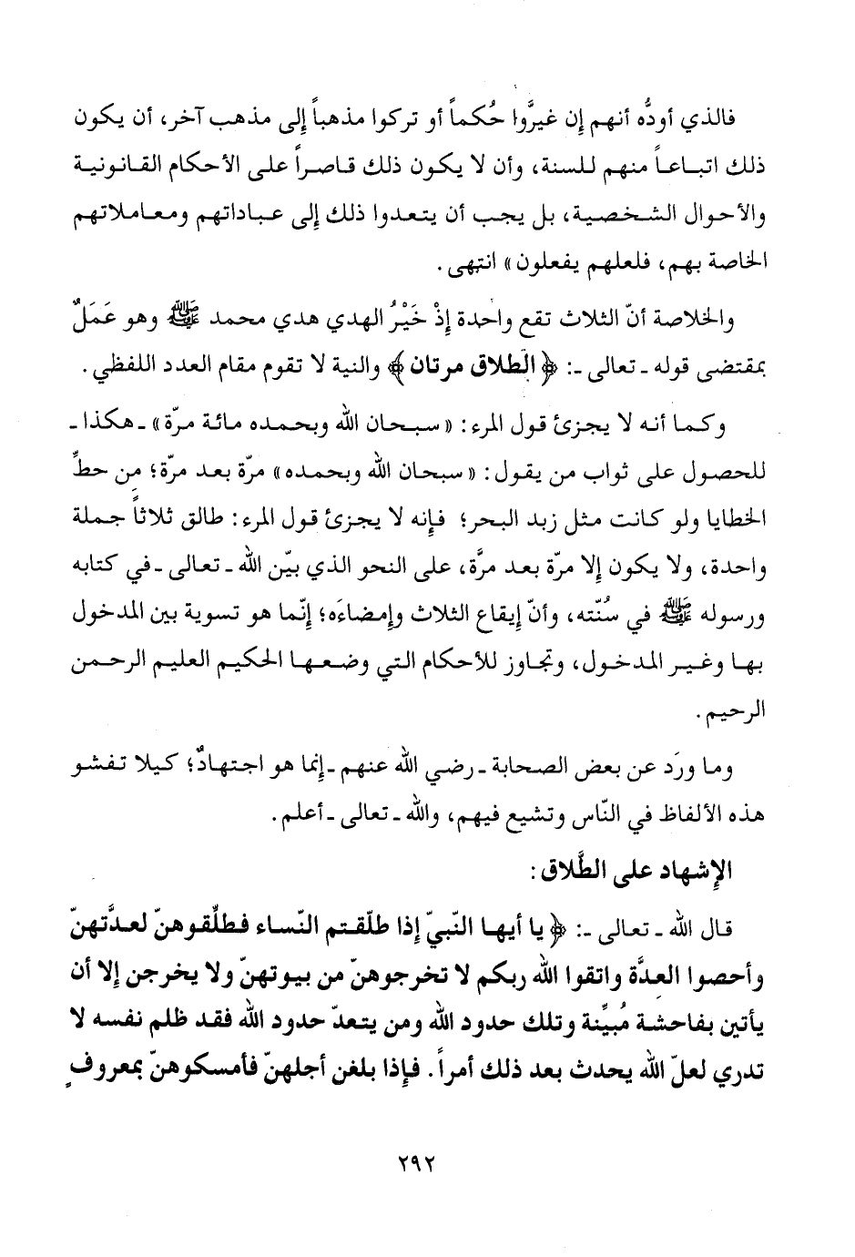 وكما أنه لا يجزئ قول المرء: "سبحان الله وبحمده مائة مرة" -هكذا- للحصول على ثواب من يقول: "سبحان الله وبحمده" مرّة بعد مرّة؛ مِن حطِّ الخطايا ولو كانت مثل زبد البحر؛ فإِنه لا يجزئ قول المرء: طالق ثلاثاً جملة واحدة، ولا يكون إِلا مرّة بعد مرَّة، على النحو الذي بيّن الله -تعالى- في كتابه ورسوله - صَلَّى اللَّهُ عَلَيْهِ وَسَلَّمَ - في سُنّته، وأنّ إِيقاع الثلاث وإمضاءَه؛ إِنّما هو تسوية بين المدخول بها وغير المدخول، وتجاوز للأحكام التي وضعها الحكيم العليم الرحمن الرحيم.
