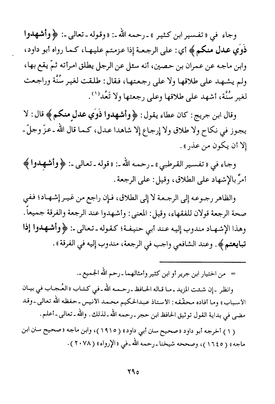 وجاء في "تفسير ابن كثير" -رحمه الله-: "وقوله -تعالى-: {وأشهدوا ذَوَي عدل منكم} أي: على الرجعة إِذا عزمتم عليها، كما رواه أبو داود، وابن ماجه عن عمران بن حصين، أنه سئل عن الرجل يطلق امرأته ثمّ يقع بها، ولم يشهد على طلاقها ولا على رجعتها، فقال: طلقت لغير سُنَّة وراجعت لغير سُنَّة، أشهد على طلاقها وعلى رجعتها ولا تَعُد (¬1).