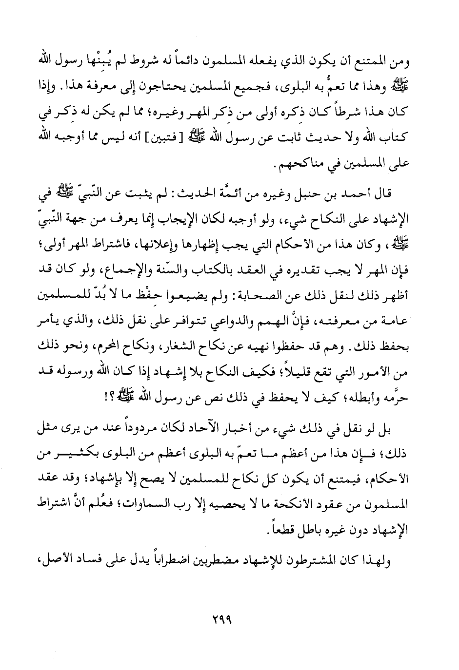 قال أحمد بن حنبل وغيره من أئمَّة الحديث: لم يثبت عن النّبيّ - صَلَّى اللَّهُ عَلَيْهِ وَسَلَّمَ - في الإِشهاد على النكاح شيء، ولو أوجبه لكان الإِيجاب إِنما يعرف من جهة النّبيّ - صَلَّى اللَّهُ عَلَيْهِ وَسَلَّمَ -، وكان هذا من الأحكام التي يجب إِظهارها وإعلانها، فاشتراط المهر أولى؛ فإِن المهر لا يجب تقديره في العقد بالكتاب والسّنة والإِجماع، ولو كان قد أظهر ذلك لنقل ذلك عن الصحابة: ولم يضيعوا حِفْظ ما لا بُدّ للمسلمين عامة من معرفته، فإِنَّ الهمم والدواعي تتوافر على نقل ذلك، والذي يأمر بحفظ ذلك. وهم قد حفظوا نهيه عن نكاح الشغار، ونكاح المحرم، ونحو ذلك من الأمور التي تقع قليلاً؛ فكيف النكاح بلا إِشهاد إِذا كان الله ورسوله قد حرَّمه وأبطله؛ كيف لا يحفظ في ذلك نص عن رسول الله - صَلَّى اللَّهُ عَلَيْهِ وَسَلَّمَ -؟!
