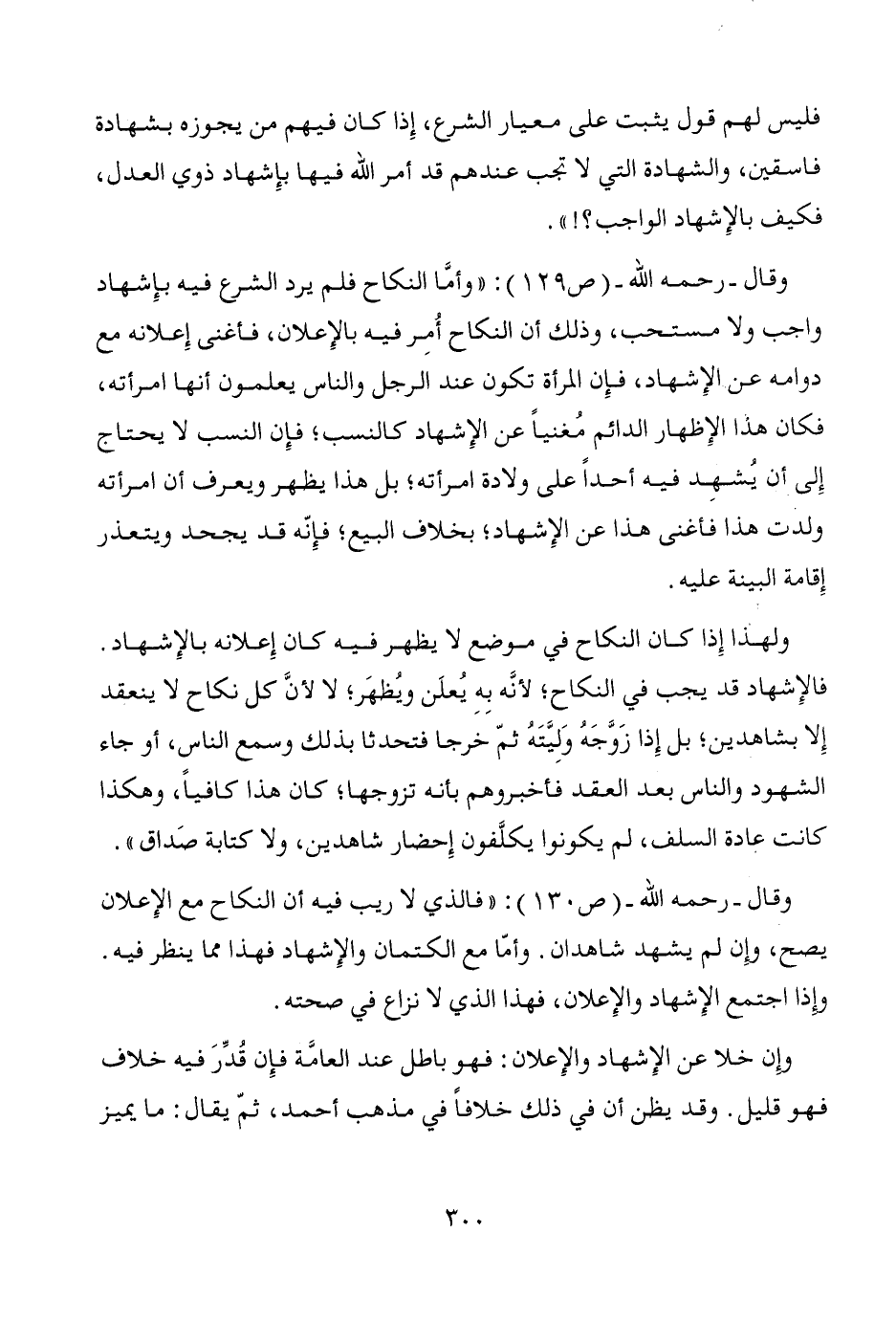 وقال -رحمه الله- (ص 130): "فالذي لا ريب فيه أن النكاح مع الإِعلان يصح، وإِن لم يشهد شاهدان. وأمّا مع الكتمان والإِشهاد فهذا مما ينظر فيه. وإذا اجتمع الإِشهاد والإِعلان، فهذا الذي لا نزاع في صحته.