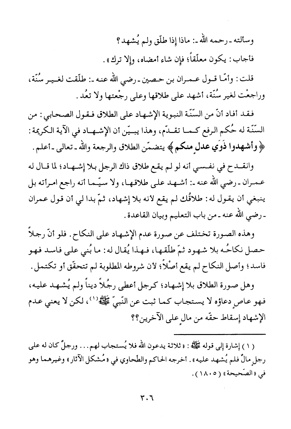 وهل صورة الطلاق بلا إِشهاد؛ كرجل أعطى رجُلاً ديناً ولم يُشهد عليه، فهو عاصٍ دعاؤه لا يستجاب كما ثبت عن النّبيّ - صَلَّى اللَّهُ عَلَيْهِ وَسَلَّمَ - (¬1)، لكن لا يعني عدم الإِشهاد إِسقاط حقّه من مالٍ على الآخرين؟؟