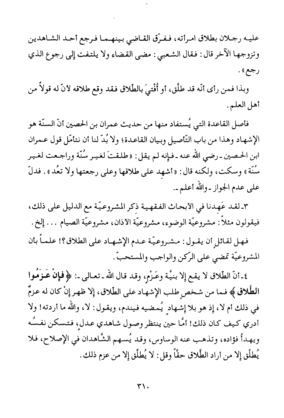 فهل لقائلٍ أن يقول: مشروعيّة عدم الإِشهاد على الطلاق؟! علماً بأن المشروعيّة تمضي على الرّكن والواجب والمستحبّ.