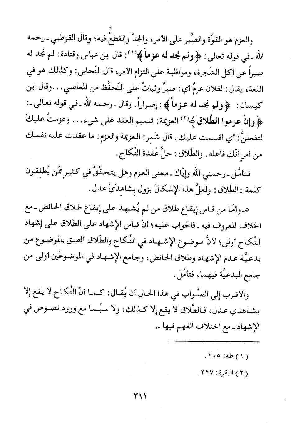 فتأمَّل -رحمني الله وإياك- معنى العزم وهل يتحقَّقُ في كثيرٍ ممن يُطلِقون كلمة "الطَّلاق" ولعلَّ هذا الإِشكالَ يزول بِشاهِدَيْ عدل.