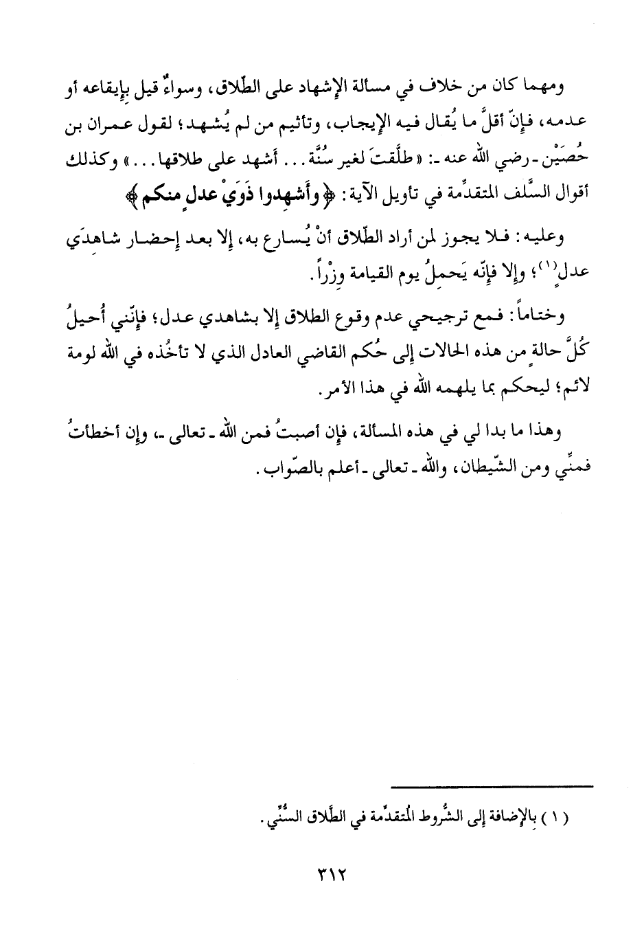 ومهما كان من خلاف في مسألة الإِشهاد على الطلاق، وسواءٌ قيل بِإِيقاعه أو عدمه، فإِنّ أقلَّ ما يُقال فيه الإِيجاب، وتأثيم من لم يُشهد؛ لقول عمران بن حُصَيْن -رضي الله عنه-: "طلَّقتَ لغير سُنَّة ... أَشهد على طلاقها ... " وكذلك أقوال السَّلف المتقدِّمة في تأويل الآية: {وأَشهِدوا ذَوَيْ عدلٍ منكم}.