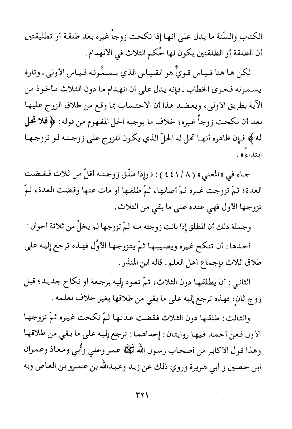 والثالث: طلقها دون الثلاث فقضت عدتها ثمّ نكحت غيره ثمّ تزوجها الأول فعن أحمد فيها روايتان: إِحداهما: ترجع إِليه على ما بقي من طلاقها وهذا قول الأكابر من أصحاب رسول الله - صَلَّى اللَّهُ عَلَيْهِ وَسَلَّمَ - عمر وعلي وأُبي ومعاذ وعمران ابن حصين وأبي هريرة وروي ذلك عن زيد وعبد الله بن عمرو بن العاص وبه