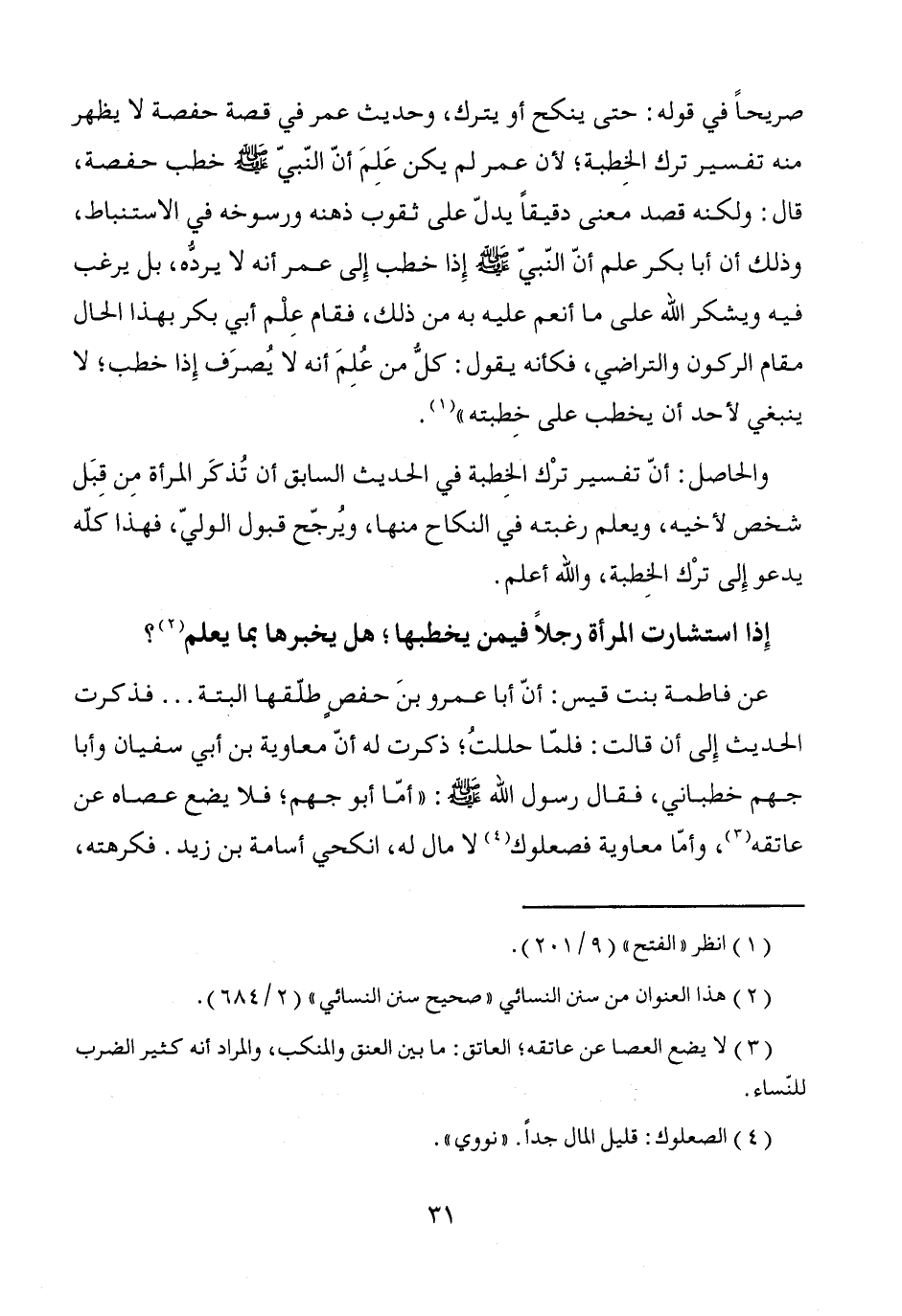 صريحاً في قوله: حتى ينكح أو يترك، وحديث عمر في قصة حفصة لا يظهر منه تفسير ترك الخِطبة؛ لأن عمر لم يكن عَلِمَ أنّ النّبيّ - صَلَّى اللَّهُ عَلَيْهِ وَسَلَّمَ - خطب حفصة، قال: ولكنه قصد معنى دقيقاً يدلّ على ثقوب ذهنه ورسوخه في الاستنباط، وذلك أن أبا بكر علم أنّ النّبيّ - صَلَّى اللَّهُ عَلَيْهِ وَسَلَّمَ - إِذا خطب إِلى عمر أنه لا يردُّه، بل يرغب فيه ويشكر الله على ما أنعم عليه به من ذلك، فقام عِلْم أبي بكر بهذا الحال مقام الركون والتراضي، فكأنه يقول: كلّ من عُلِمَ أنه لا يُصرَف إِذا خطب؛ لا ينبغي لأحد أن يخطب على خِطبته" (¬1).