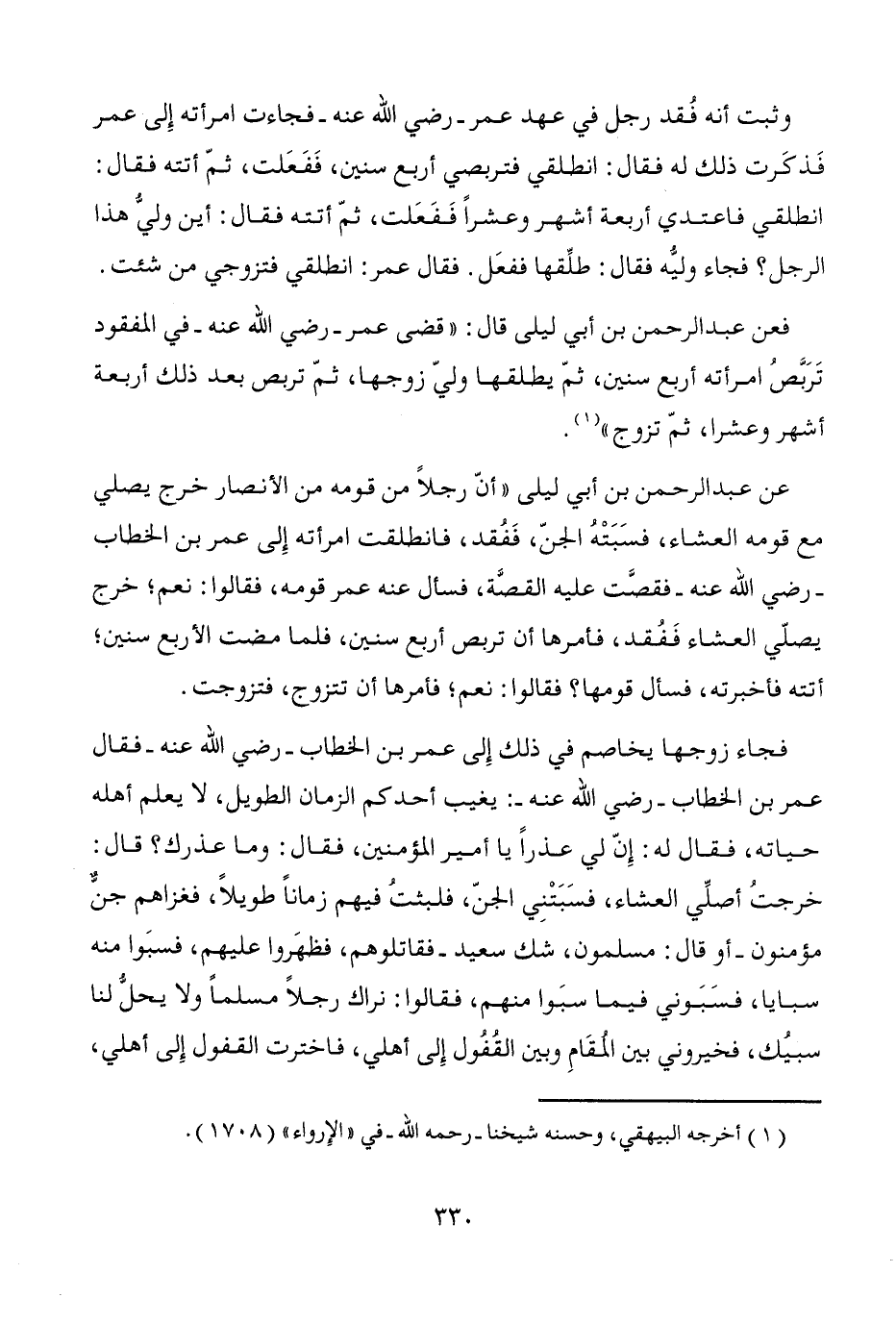 عن عبد الرحمن بن أبي ليلى "أنّ رجلاً من قومه من الأنصار خرج يصلّي مع قومه العشاء، فسَبَتْهُ الجنّ، فَفُقد، فانطلقت امرأته إِلى عمر بن الخطاب -رضي الله عنه- فقصَّت عليه القصَّة، فسأل عنه عمر قومه، فقالوا: نعم؛ خرج يصلّي العشاء فَفُقد، فأمرها أن تربص أربع سنين، فلما مضت الأربع سنين؛ أتته فأخبرته، فسأل قومها؟ فقالوا: نعم؛ فأمرها أن تتزوج، فتزوجت.