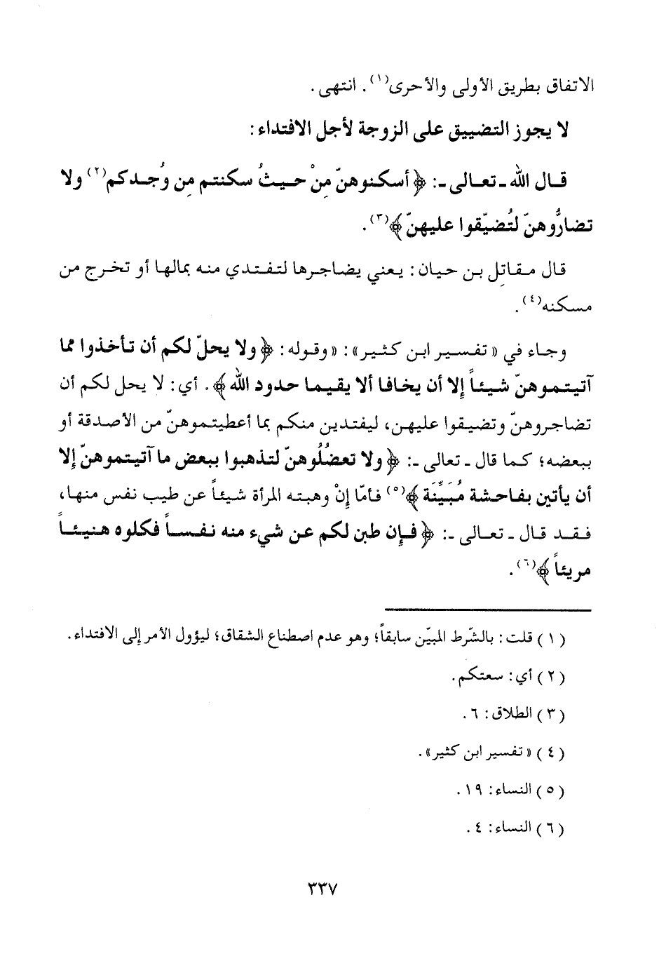 وجاء في "تفسير ابن كثير": "وقوله: {ولا يحلّ لكم أن تأخذوا مما آتيتموهنّ شيئاً إِلا أن يخافا ألا يقيما حدود الله}. أي: لا يحل لكم أن تضاجروهنّ وتضيقوا عليهن، ليفتدين منكم بما أعطيتموهنّ من الأصدقة أو ببعضه؛ كما قال -تعالى-: {ولا تعضُلُوهنّ لتذهبوا ببعض ما آتيتموهنّ إِلا أن يأتين بفاحشة مُبَيِّنَة} (¬5) فأما إِنْ وهبته المرأة شيئاً عن طيب نفس منها، فقد قال -تعالى-: {فإِن طبن لكم عن شيء منه فكلوه هنيئاً مريئاً} (¬6).
