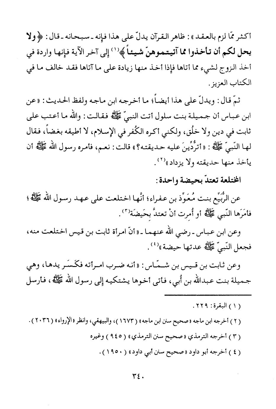 ثمّ قال: ويدلّ على هذا أيضاً؛ ما أخرجه ابن ماجه ولفظ الحديث: "عن ابن عباس أن جميلة بنت سلول أتت النبيّ - صَلَّى اللَّهُ عَلَيْهِ وَسَلَّمَ - فقالت: والله ما أعتب على ثابت في دين ولا خلُق، ولكني أكره الكُفر في الإِسلام، لا أطيقه بغضاً، فقال لها النّبيّ - صَلَّى اللَّهُ عَلَيْهِ وَسَلَّمَ -: "أترُّدِّينَ عليه حديقته؟ " قالت: نعم، فأمره رسول الله - صَلَّى اللَّهُ عَلَيْهِ وَسَلَّمَ - أن يأخذ منها حديقته ولا يزداد" (¬2).