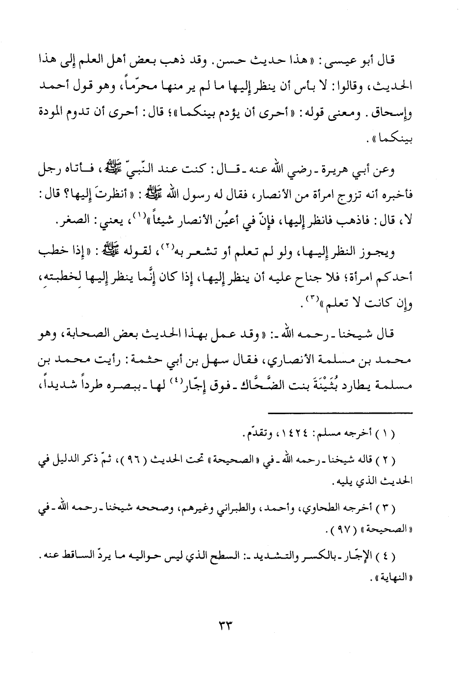 قال أبو عيسى: "هذا حديث حسن. وقد ذهب بعض أهل العلم إِلى هذا الحديث، وقالوا: لا بأس أن ينظر إِليها ما لم ير منها محرّماً، وهو قول أحمد وإسحاق. ومعنى قوله: "أحرى أن يؤدم بينكما"؛ قال: أحرى أن تدوم المودة بينكما".