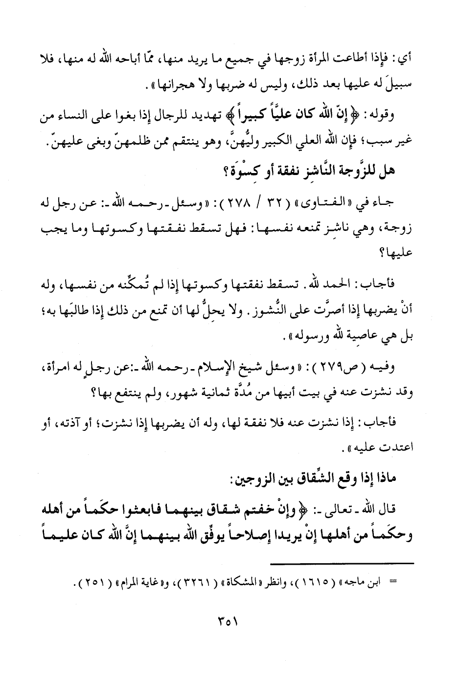 وفيه (ص 279): "وسئل شيخ الإِسلام -رحمه الله-: عن رجلٍ له امرأة، وقد نشزت عنه في بيت أبيها من مُدَّة ثمانية شهور، ولم ينتفع بها؟