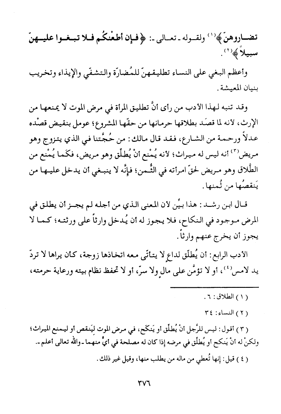 وقد تنبه لهذا الأدب من رأى أنَّ تطليق المرأة في مرض الموت لا يمنعها من الإِرث، لأنه لما قصَد بطلاقها حرمانها من حقّها المشروع؛ عومل بنقيض قصْده عدلاً ورحمة من الشارع، فقد قال مالك: من حُجَّتنا في الذي يتزوج وهو مريض (¬3) أنه ليس له ميراث؛ لأنه يُمْنع أنْ يُطلِّق وهو مريض، فكَما يُمْنع من الطَّلاق وهو مريض لحقّ امرأته في الثُّمن؛ فإِنَّه لا ينبغي أن يدخل عليها من يَنقصُها من ثُمنها.