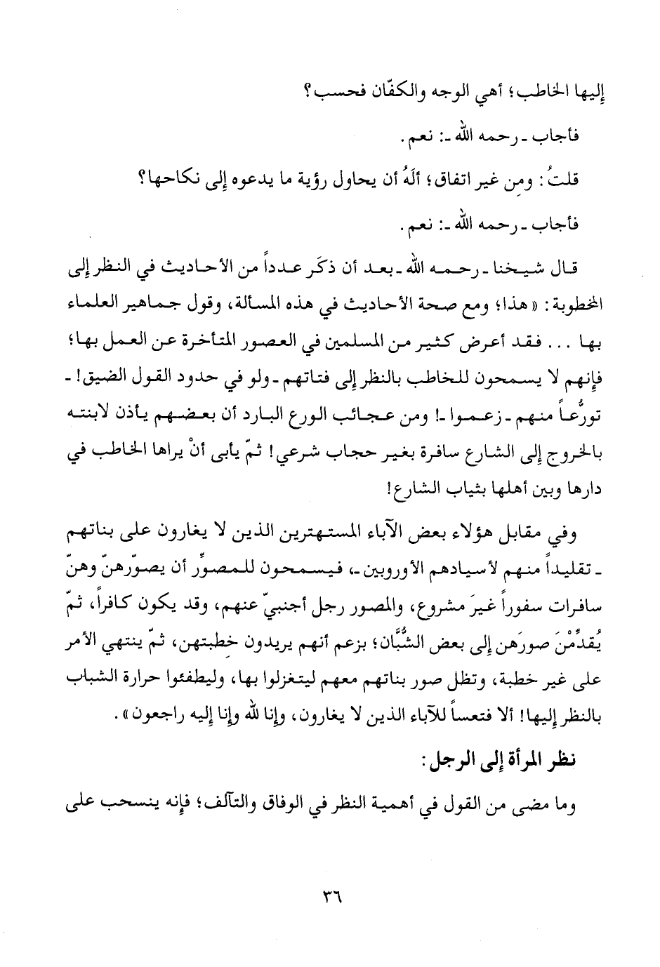 قال شيخنا -رحمه الله- بعد أن ذكَر عدداً من الأحاديث في النظر إِلى الخطوبة: "هذا؛ ومع صحة الأحاديث في هذه المسألة، وقول جماهير العلماء بها ... فقد أعرض كثير من المسلمين في العصور المتأخرة عن العمل بها؛ فإِنهم لا يسمحون للخاطب بالنظر إِلى فتاتهم -ولو في حدود القول الضيق! - تورُّعاً منهم -زعموا-! ومن عجائب الورع البارد أن بعضهم يأذن لابنته بالخروج إِلى الشارع سافرة بغير حجاب شرعي! ثمّ يأبى أنْ يراها الخاطب في دارها وبين أهلها بثياب الشارع!