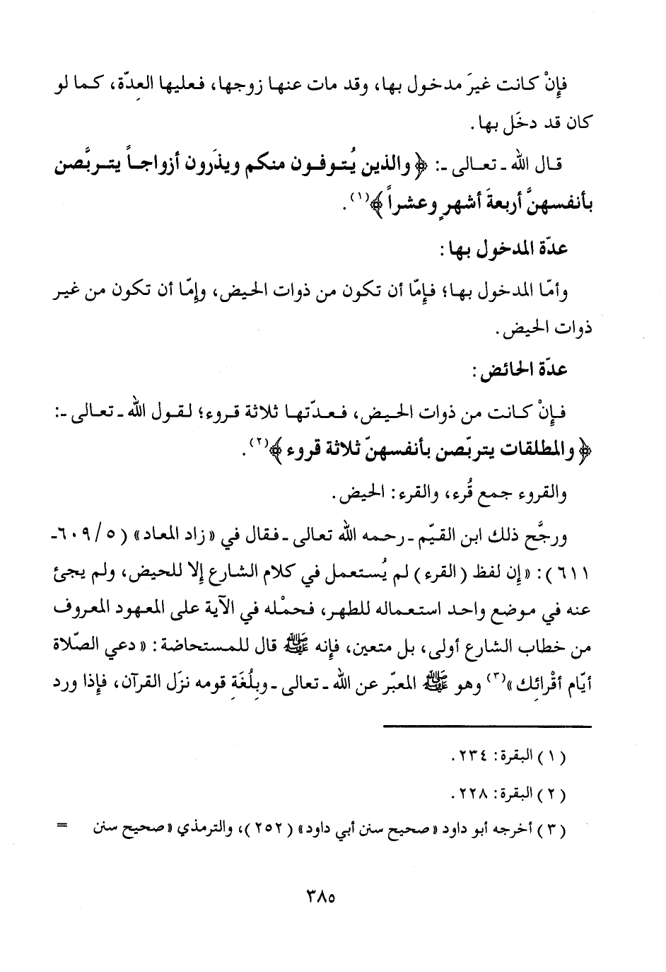 فإِنْ كانت من ذوات الحيض، فعدّتها ثلاثة قروء؛ لقول الله -تعالى-: {والمطلقات يتربّصن بأنفسهنّ ثلاثة قروء} (¬2).
