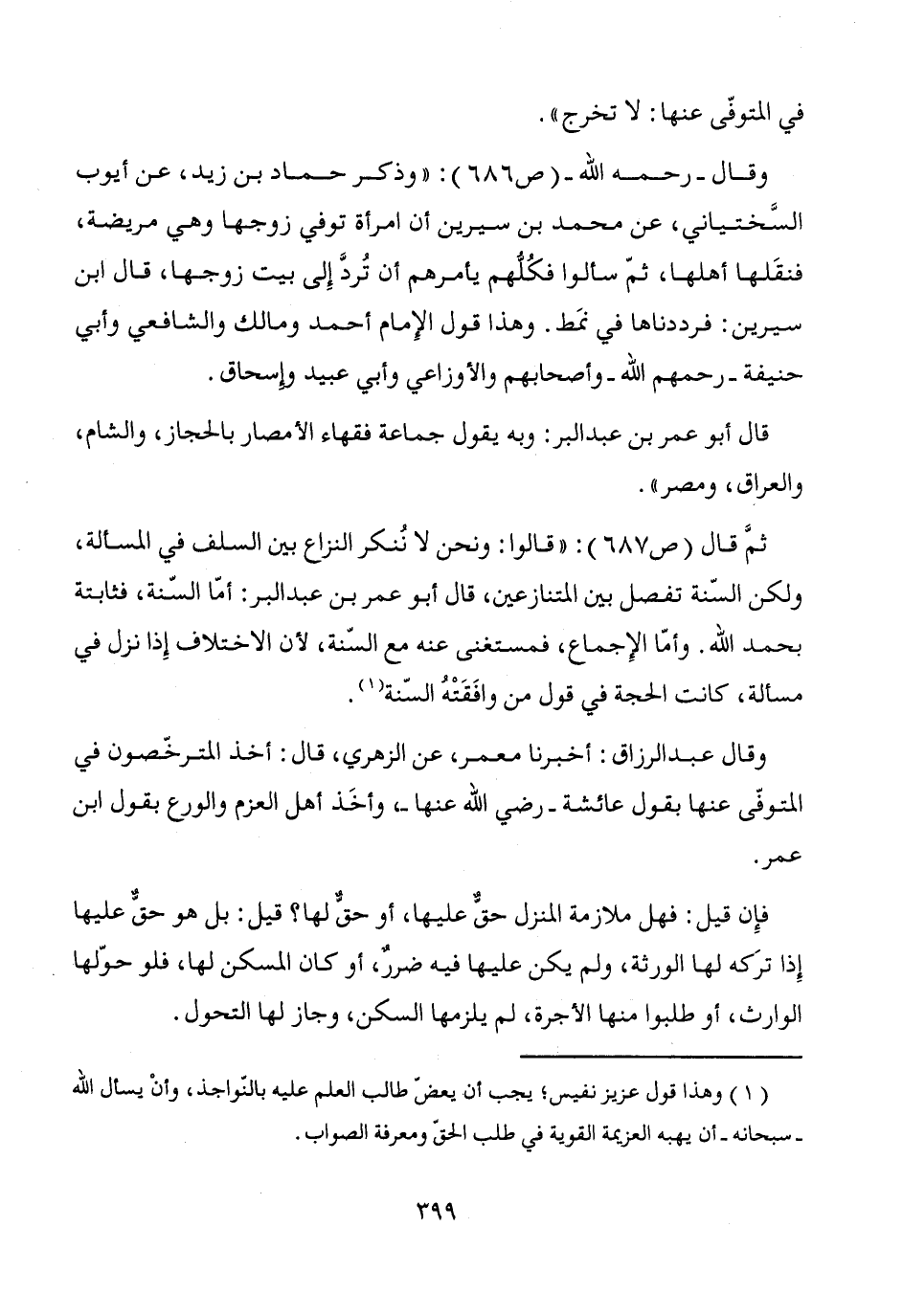 وقال -رحمه الله- (ص 686): "وذكر حماد بن زيد، عن أيوب السَّختياني، عن محمد بن سيرين أن امرأة توفي زوجها وهي مريضة، فنقَلها أهلها، ثمّ سألوا فكُلُّهم يأمرهم أن تُردَّ إِلى بيت زوجها، قال ابن سيرين: فرددناها في نمَط. وهذا قول الإِمام أحمد ومالك والشافعي وأبي حنيفة -رحمهم الله- وأصحابهم والأوزاعي وأبي عبيد وإسحاق.
