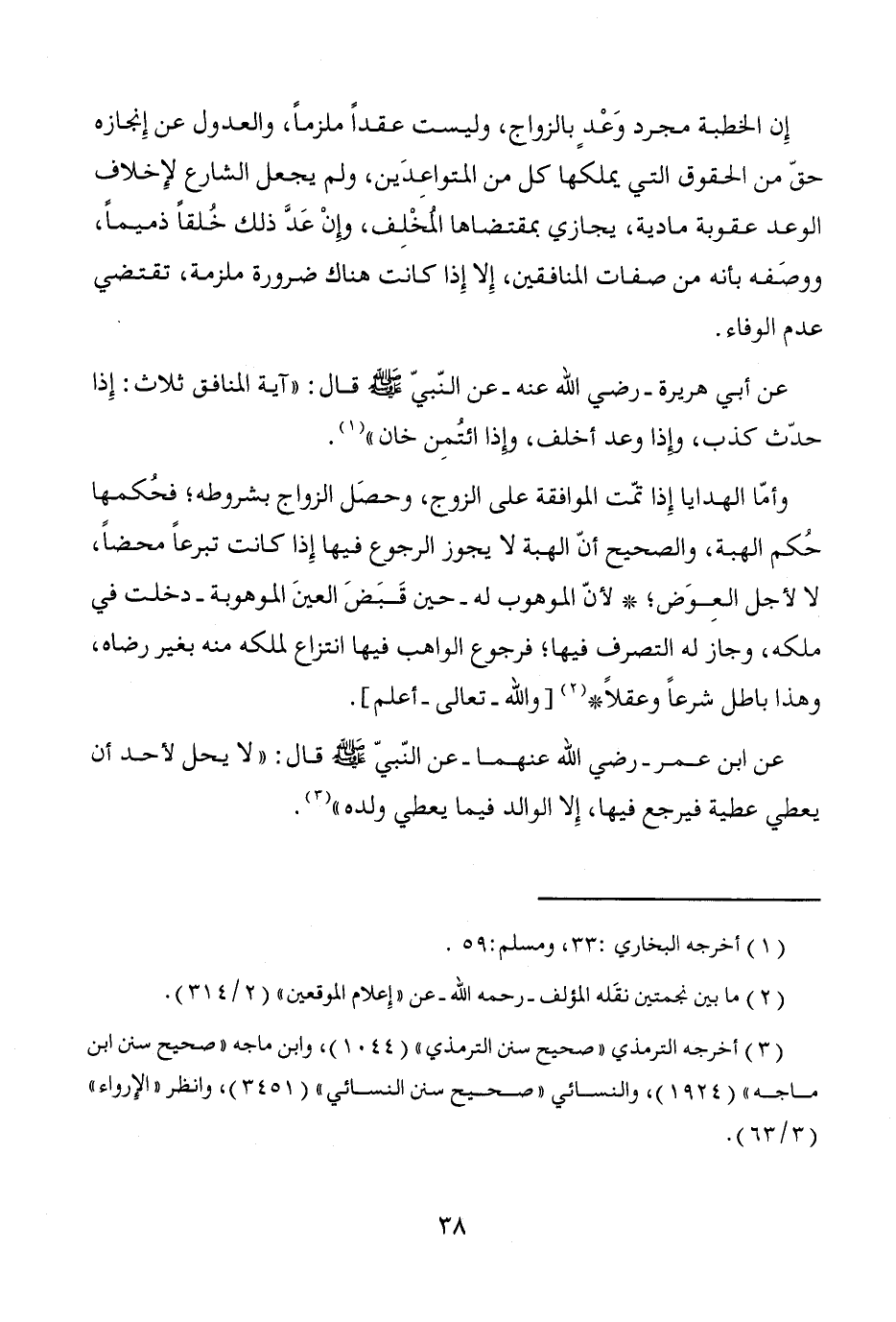 إِن الخطبة مجرد وَعْدٍ بالزواج، وليست عقداً ملزماً، والعدول عن إِنجازه حقّ من الحقوق التي يملكها كل من المتواعِدَين، ولم يجعل الشارع لإِخلاف الوعد عقوبة مادية، يجازي بمقتضاها المُخْلِف، وإنْ عَدَّ ذلك خُلقاً ذميماً، ووصَفه بأنه من صفات المنافقين، إِلا إِذا كانت هناك ضرورة ملزمة، تقتضي عدم الوفاء.