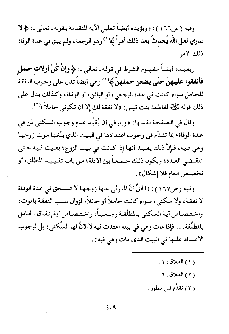 وقال في الصفحة نفسها: "وينبغي أن يُقيَّد عدم وجوب السكنى لمن في عدة الوفاة؛ بما تقدّم في وجوب اعتدادها في البيت الذي بلَغها موت زوجها وهي فيه، فإِنَّ ذلك يفيد أنها إِذا كانت في بيت الزوج؛ بقيت فيه حتى تنقضي العدة؛ ويكون ذلك جمعاً بين الأدلة؛ من باب تقييد المطلق، أو تخصيص العام فلا إِشكال".