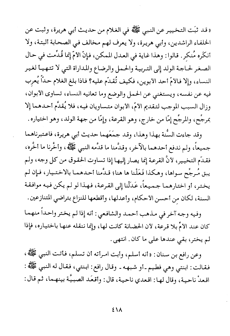 "قد ثبَت التخيير عن النبي - صَلَّى اللَّهُ عَلَيْهِ وَسَلَّمَ - في الغلام من حديث أبي هريرة، وثبت عن الخلفاء الراشدين، وأبي هريرة، ولا يعرف لهم مخالف في الصحابة ألبتة، ولا أنكَره مُنكِر. قالوا: وهذا غاية في العدل الممكن، فإِنّ الأمّ إِنما قُدِّمت في حال الصغر لحاجة الولد إِلى التربية والحمل والرضاع والمداراة التي لا تتهيأ لغير النساء، وإِلا فالأمّ أحد الأبوين، فكيف تُقدّم عليه؟ فاذا بلغ الغلام حدّاً يُعرِب فيه عن نفسه، ويستغني عن الحمل والوضع وما تعانيه النساء، تساوى الأبوان، وزال السبب الموجب لتقديم الأمّ، الأبوان متساويان فيه، فلا يُقدَّم أحدهما إِلا بمرجِّح، والمرجِّح إِمّا من خارج، وهو القرعة، وإمّا من جهة الولد، وهو اختياره.