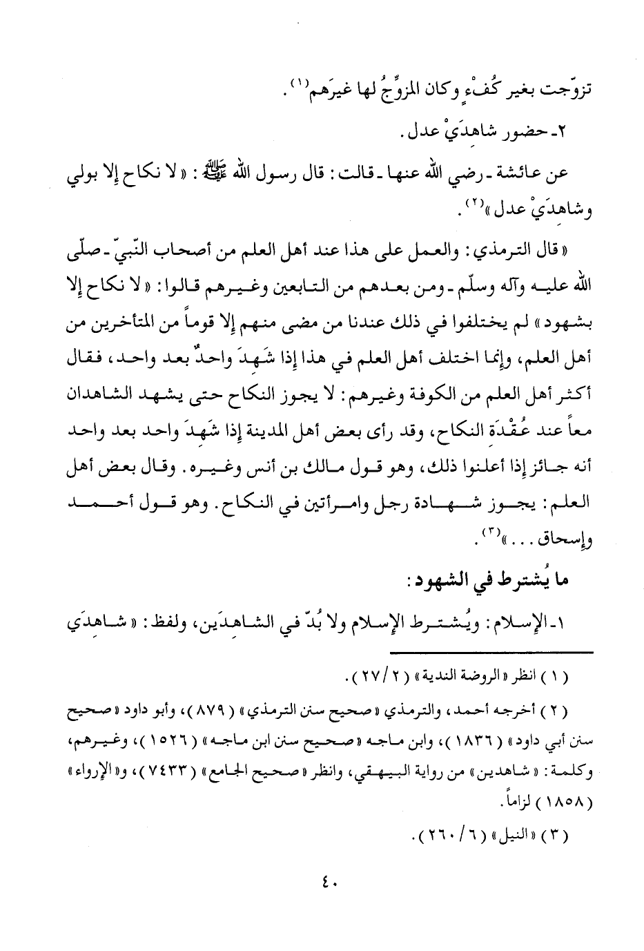 (¬2) أخرجه أحمد، والترمذي "صحيح سنن الترمذي" (879)، وأبو داود "صحيح سنن أبي داود" (1836)، وابن ماجه "صحيح سنن ابن ماجه" (1526)، وغيرهم، وكلمة: "شاهدين" من رواية البيهقي، وانظر "صحيح الجامع" (7433)، و"الإِرواء" (1858) لزاماً.