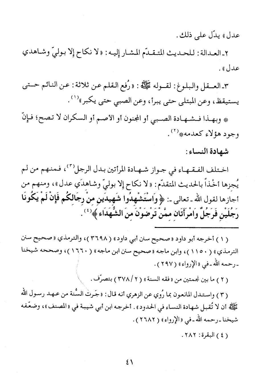 (¬3) واستدل المانعون بما رُوي عن الزهري أنه قال: "جَرت السُّنة من عهد رسول الله - صَلَّى اللَّهُ عَلَيْهِ وَسَلَّمَ - أن لا تُقبل شهادة النساء في الحدود". أخرجه ابن أبي شيبة في "المصنف"، وضعّفه شيخنا -رحمه الله- في "الإِرواء" (2682).