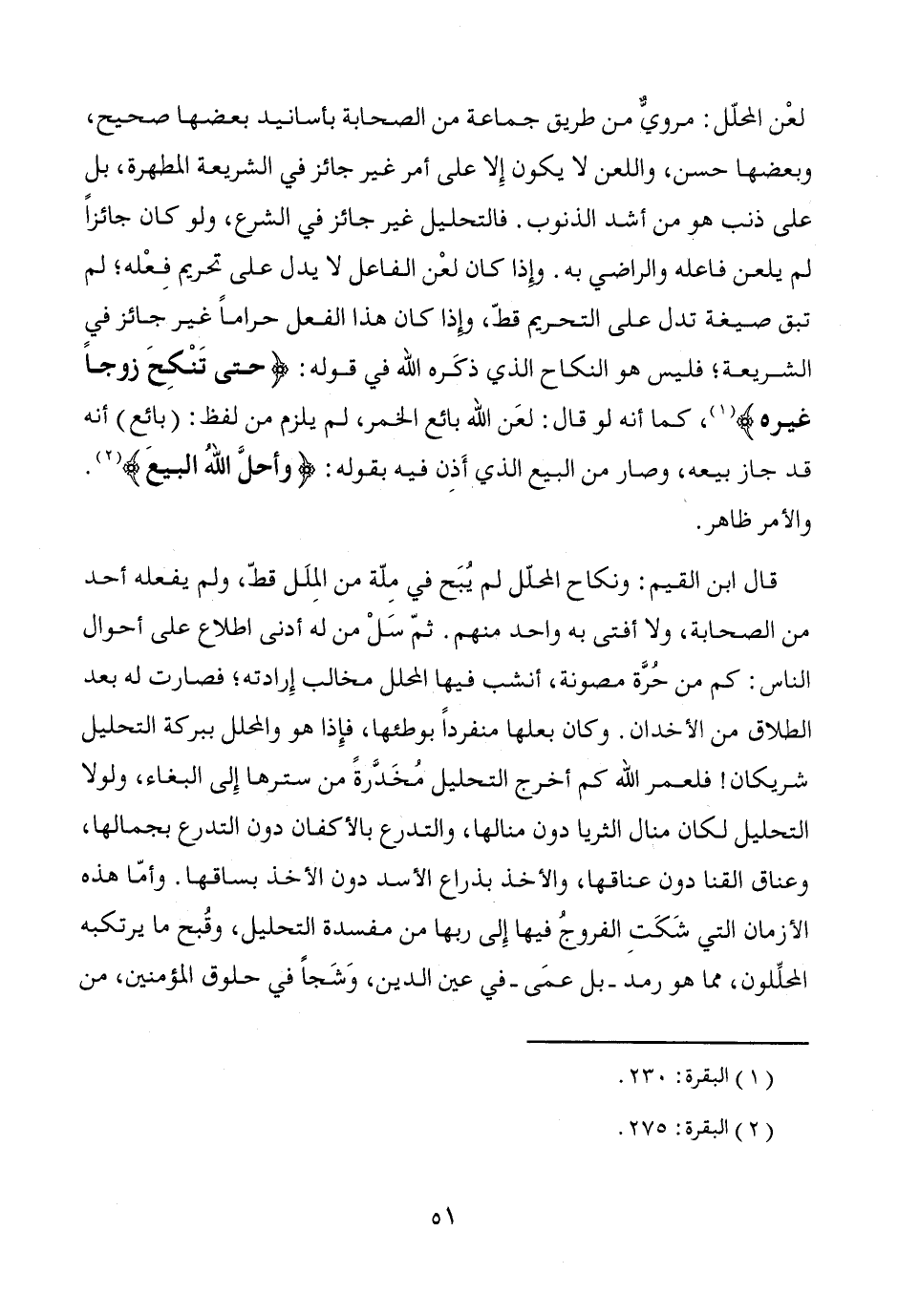 لعْن المحلّل: مرويٌّ من طريق جماعة من الصحابة بأسانيد بعضها صحيح، وبعضها حسن، واللعن لا يكون إِلا على أمر غير جائز في الشريعة المطهرة، بل على ذنب هو من أشد الذنوب. فالتحليل غير جائز في الشرع، ولو كان جائزاً لم يلعن فاعله والراضي به. وإذا كان لعْن الفاعل لا يدل على تحريم فِعْله؛ لم تبق صيغة تدل على التحريم قطّ، وإذا كان هذا الفعل حراماً غير جائز في الشريعة؛ فليس هو النكاح الذي ذكَره الله في قوله: {حتى تَنْكِحَ زوجاً غيره} (¬1)، كما أنه لو قال: لعَن الله بائع الخمر، لم يلزم من لفظ: (بائع) أنه قد جاز بيعه، وصار من البيع الذي أَذِن فيه بقوله: {وأحلَّ اللهُ البيعَ} (¬2). والأمر ظاهر.