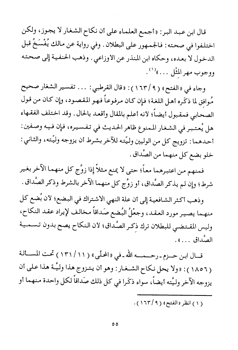 وجاء في "الفتح" (9/ 163): "قال القرطبي: ... تفسير الشغار صحيح مُوافِق لما ذكَره أهل اللغة؛ فإِن كان مرفوعاً فهو المقصود، وإن كان من قول الصحابي فمقبول أيضاً؛ لأنه أعلم بالمقال وأقعد بالحال. وقد اختلف الفقهاء هل يُعتبر في الشغار الممنوع ظاهر الحديث في تفسيره، فإِن فيه وصفين: أحدهما: تزويج كل من الوليين وليّته للآخر بشرط أن يزوجه وليّته، والثاني: خلو بضع كل منهما من الصَّداق.