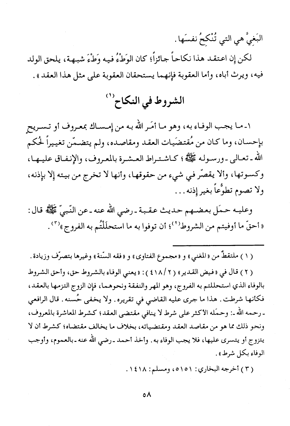 (¬2) قال في "فيض القدير" (2/ 418): "يعني الوفاء بالشروط حق، وأحق الشروط بالوفاء الذي استحللتم به الفروج، وهو المهر والنفقة ونحوهما، فإِن الزوج التزمها بالعقد، فكأنها شرطت. هذا ما جرى عليه القاضي في تقريره. ولا يخفى حُسنه. قال الرافعي -رحمه الله-: وحمَله الأكثر على شرط لا ينافي مقتضى العقد؛ كشرط المعاشرة بالمعروف، ونحو ذلك مما هو من مقاصد العقد ومقتضياته، بخلاف ما يخالف مقتضاه؛ كشرط أن لا يتزوج أو يتسرى عليها، فلا يجب الوفاء به. وأخذ أحمد -رضي الله عنه- بالعموم، وأوجب الوفاء بكل شرط".