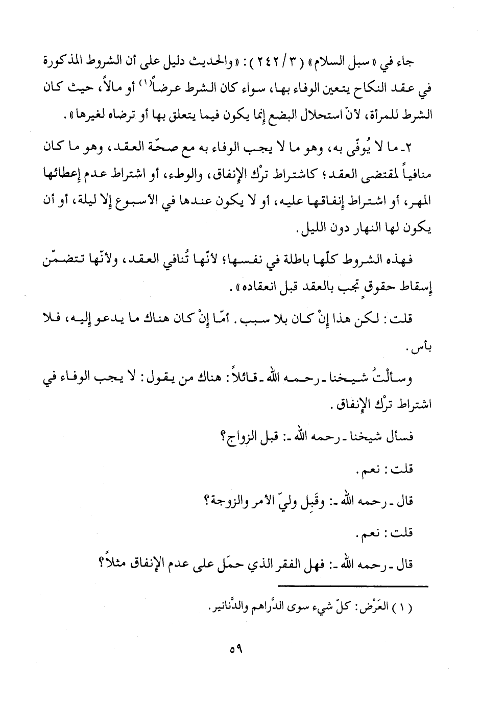 وسألتُ شيخنا -رحمه الله- قائلاً: هناك من يقول: لا يجب الوفاء في اشتراط ترْك الإِنفاق.