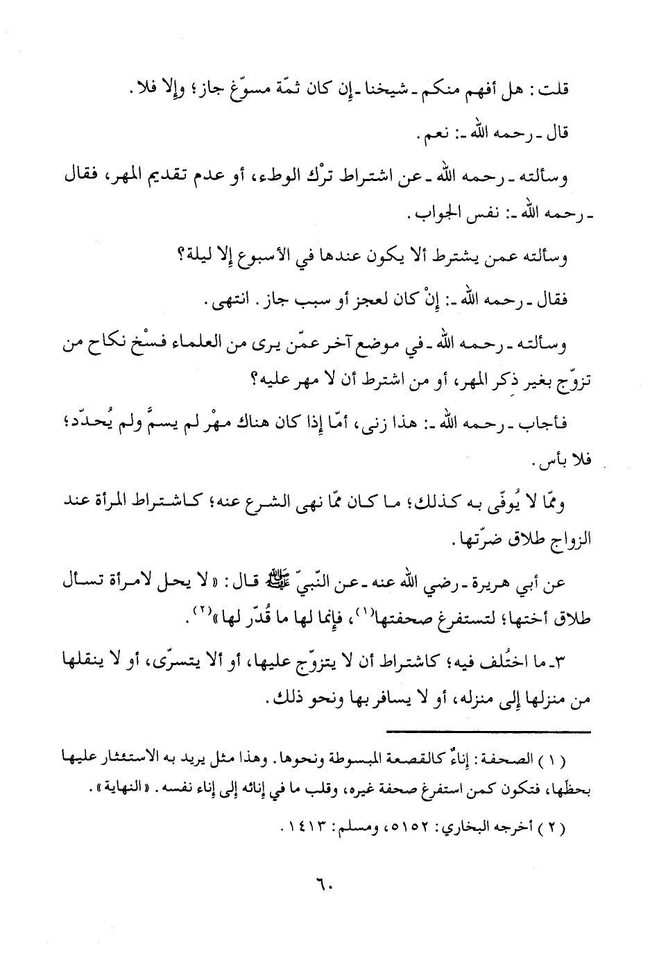 وسألته -رحمه الله- عن اشتراط ترْك الوطء، أو عدم تقديم المهر، فقال -رحمه الله-: نفس الجواب.