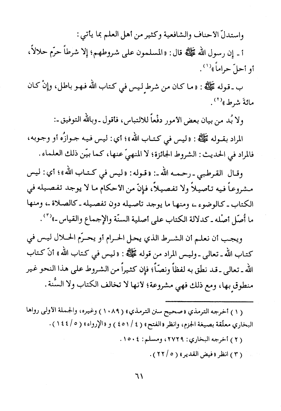 أ- إِن رسول الله - صَلَّى اللَّهُ عَلَيْهِ وَسَلَّمَ - قال: "المسلمون على شروطهم؛ إِلا شرطاً حرّم حلالاً، أو أحل حراماً" (¬1).