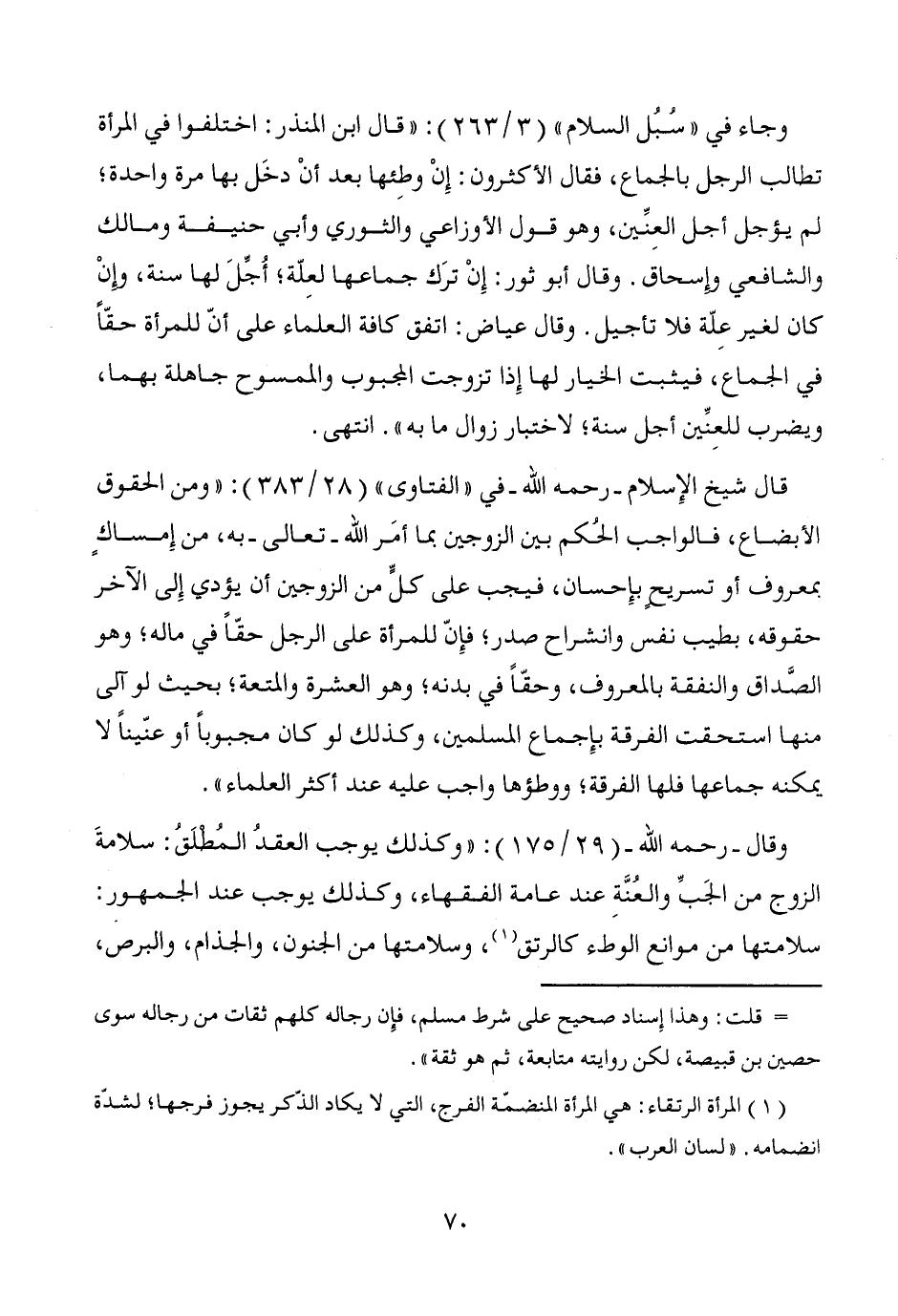 وقال -رحمه الله- (29/ 175): "وكذلك يوجب العقدُ المُطْلَق: سلامةَ الزوج من الجَبِّ والعُنَّةِ عند عامة الفقهاء، وكذلك يوجب عند الجمهور: سلامتها من موانع الوطء كالرتق (¬1)، وسلامتها من الجنون، والجذام، والبرص،