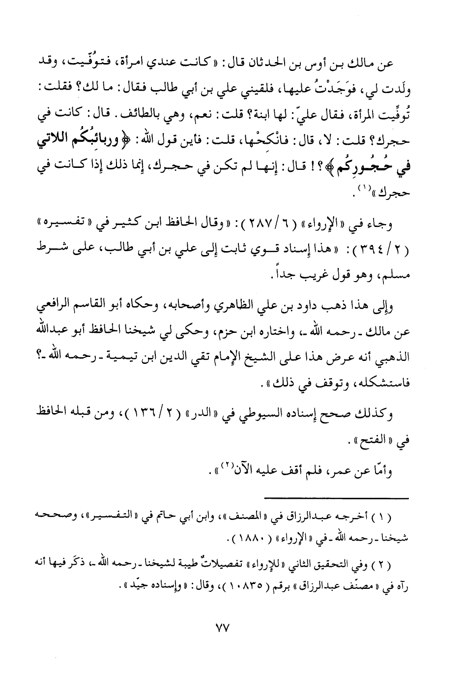 عن مالك بن أوس بن الحدثان قال: "كانت عندي امرأة، فتوُفّيت، وقد ولَدت لي، فوَجَدْتُ عليها، فلقيني علي بن أبي طالب فقال: ما لك؟ فقلت: تُوفِّيت المرأة، فقال عليّ: لها ابنة؟ قلت: نعم، وهي بالطائف. قال: كانت في حجرك؟ قلت: لا، قال: فانْكِحْها، قلت: فأين قول الله: {وربائِبُكم اللاتي في حُجُورِكُم}؟! قال: إِنها لم تكن في حجرك، إِنما ذلك إِذا كانت في حجرك" (¬1).