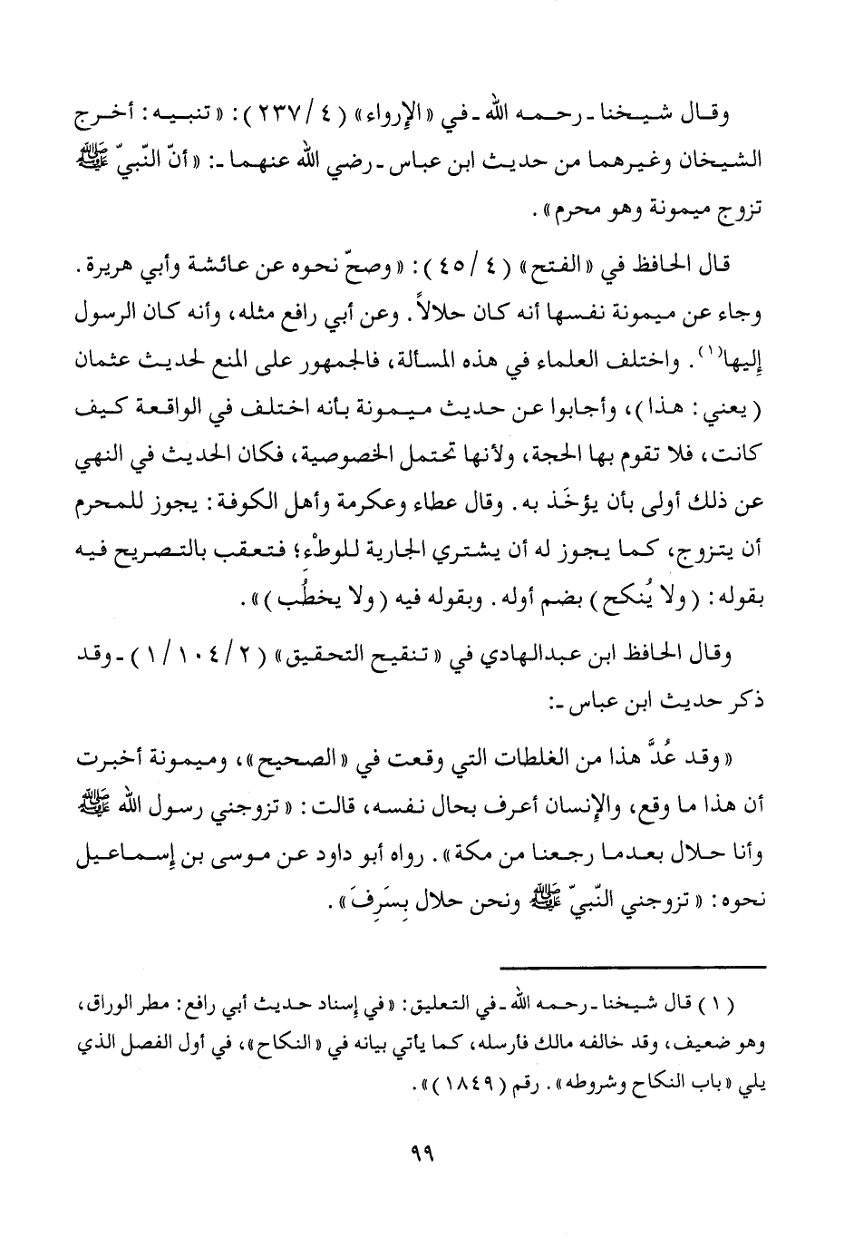 وقال شيخنا -رحمه الله- في "الإِرواء" (4/ 237): "تنبيه: أخرج الشيخان وغيرهما من حديث ابن عباس -رضي الله عنهما-: "أنّ النّبيّ - صَلَّى اللَّهُ عَلَيْهِ وَسَلَّمَ - تزوج ميمونة وهو محرم".