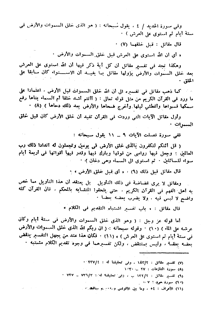 وهكذا نجد فى تفسير مقاتل ان كل آية ذكر فيها ان الله استوى على العرش بعد خلق السموات والأرض يؤولها مقاتل بما يفيد ان الاستواء كان سابقا على الخلق.
