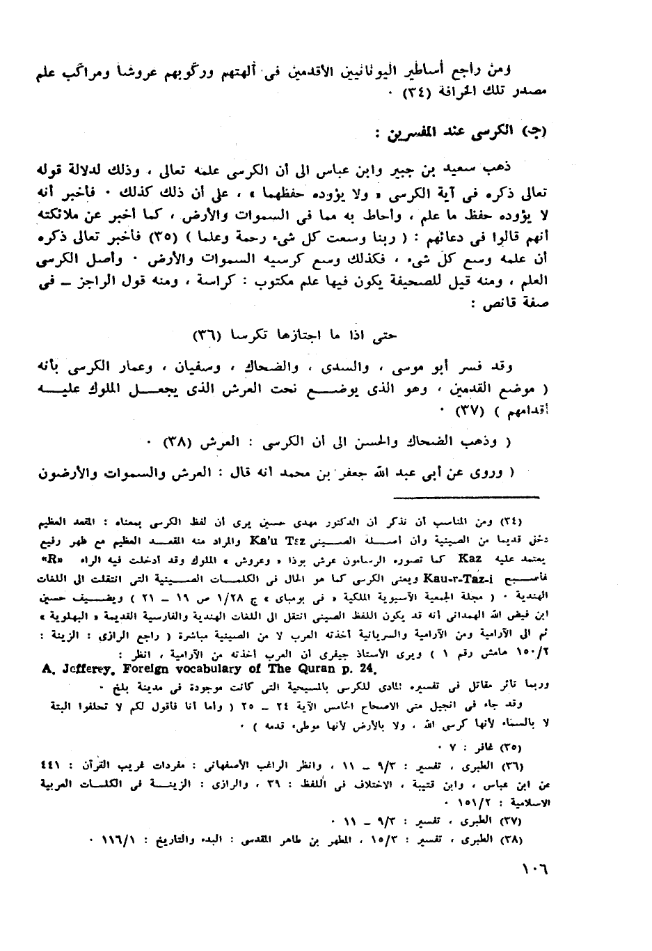 (34) ومن المناسب ان نذكر ان الدكتور مهدى حسين يرى ان لفظ الكرسي بمعناه: المقعد العظيم دخل قديما من الصينية وان أصله الصيني والمراد منه المقعد العظيم مع ظهر رفيع يعتمد عليه كما تصوره الرسامون عرش بوذا «وعروش» الملوك وقد ادخلت فيه الراء «» فأصبح--- ويعنى الكرسي كما هو الحال فى الكلمات الصينية التي انتقلت الى اللغات الهندية. (مجلة الجمعية الآسيوية الملكية «فى بومباى» ج 28/ 1 ص 19- 21) ويضيف حسين ابن فيض الله الهمداني انه قد يكون اللفظ الصيني انتقل الى اللغات الهندية والفارسية القديمة «البهلوية» ثم الى الآرامية ومن الآرامية والسريانية أخذته العرب لا من الصينية مباشرة (راجع الرازي: الزينة:
