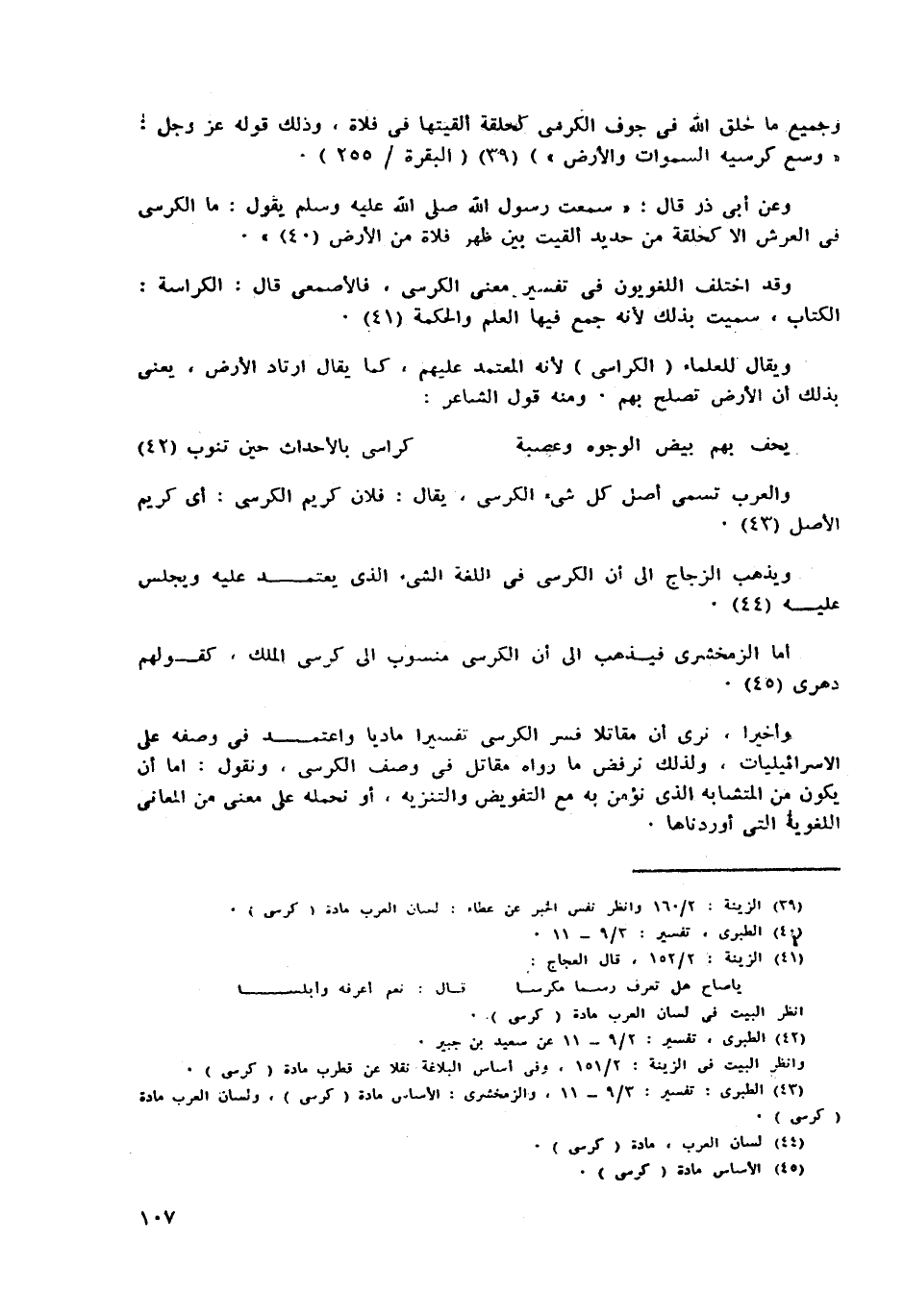 (43) الطبري: تفسير: 3/ 9- 11، والزمخشري: الأساس مادة (كرسي) ، ولسان العرب مادة (كرسي) . [.....]