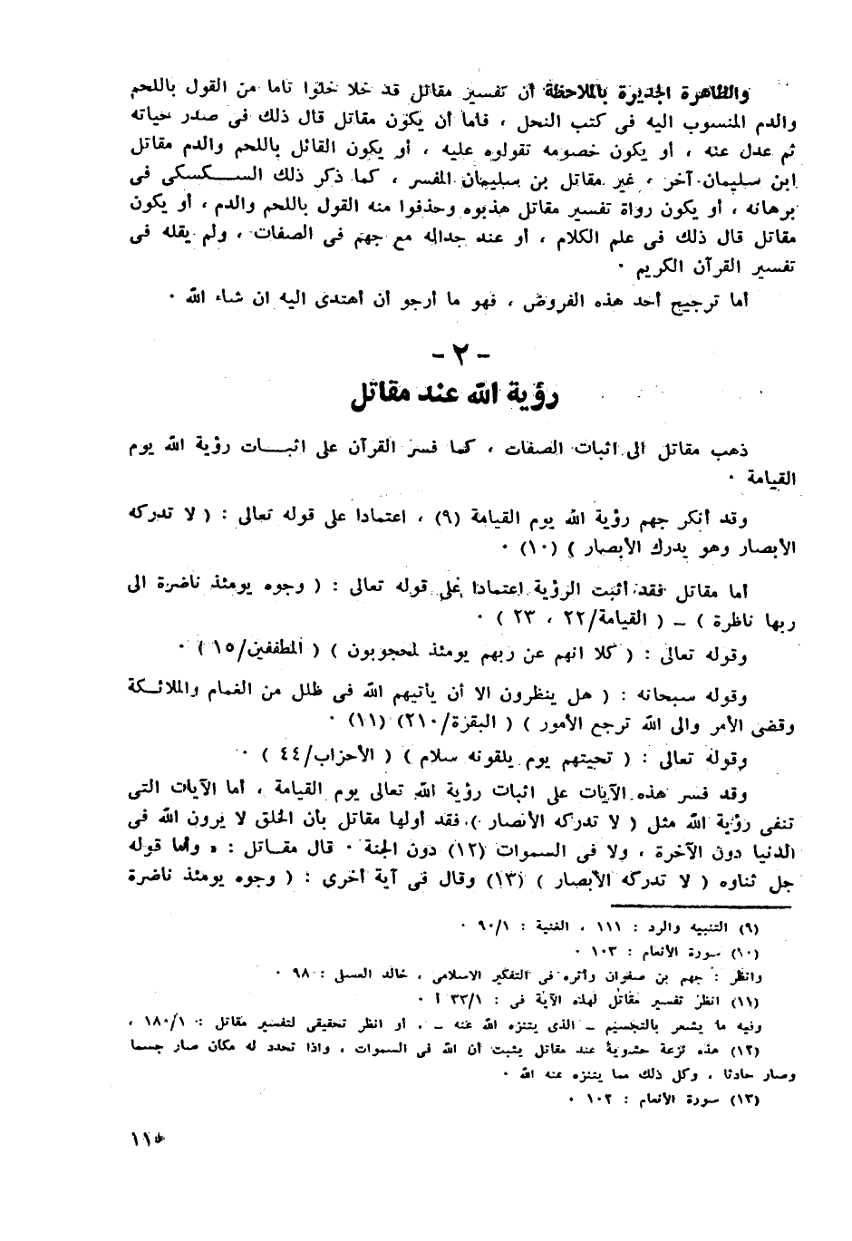 (12) هذه نزعة حشوية عند مقاتل يثبت ان الله فى السماوات، وإذا تحدد له مكان صار جسما وصار حادثا، وكل ذلك مما يتنزه عنه الله.